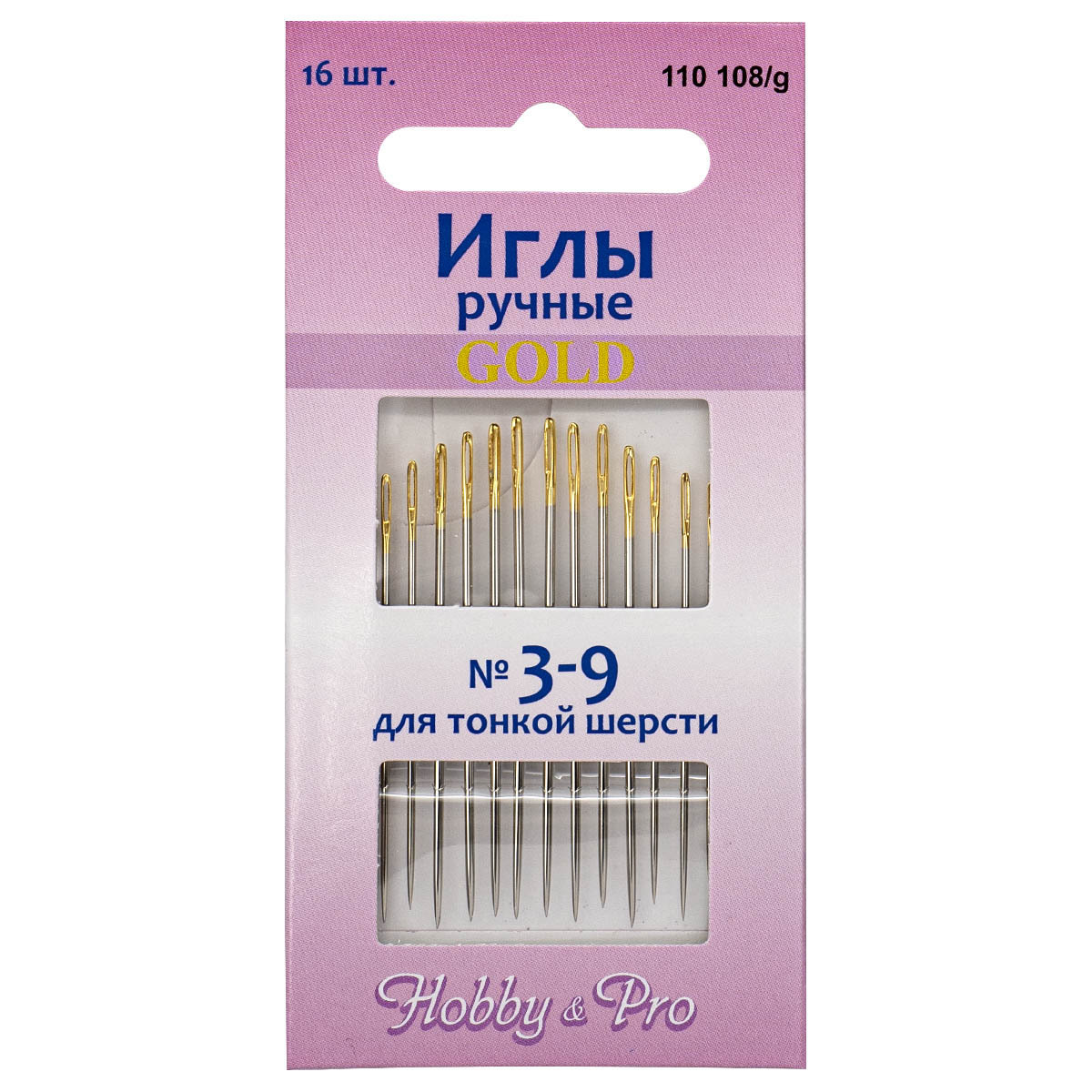 Иглы ручные вышивальные с золотым ушком для тонкой шерсти №3-9, 16 игл, Hobby&Pro, 110108/g
