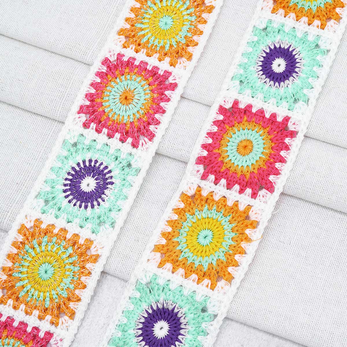 Тесьма декоративная вязаная бабушкин квадрат 50 мм / 9.14 метра, белый/разноцветный, 129N-031