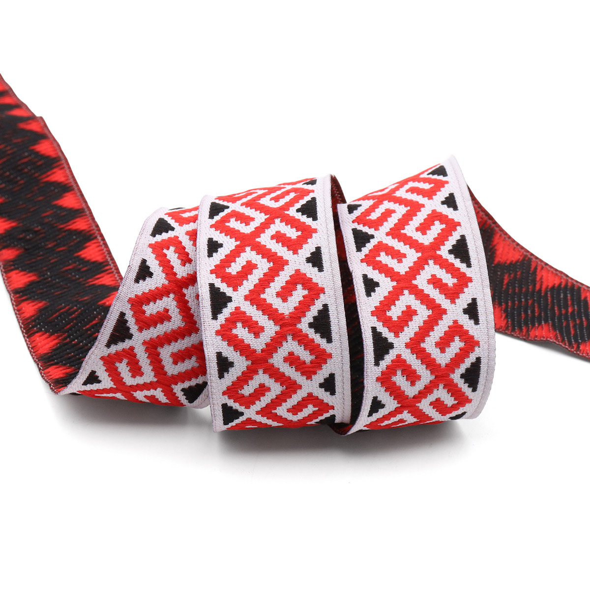 Жаккардовая лента имеет объемный плетеный узор из цветных нитей, напоминающий вышивку. Поскольку рисунок образуется переплетением нитей, а не печатается на готовой ткани, он не поблекнет и не сотрется. Применение: – украшение домашнего текстиля – покрывал, наволочек, мебельных чехлов; – отделка и ремонт предметов одежды, особенно одежды для выступлений; – такие ленты можно пришивать как ручки для сумок и рюкзаков, подвязок, подтяжек и ремней. Чтобы пришить жаккардовую ленту к материалу, используйте простую машинную строчку. Материал: 100% полиэстер. Размер: ширина 28 мм, длина 10 м.