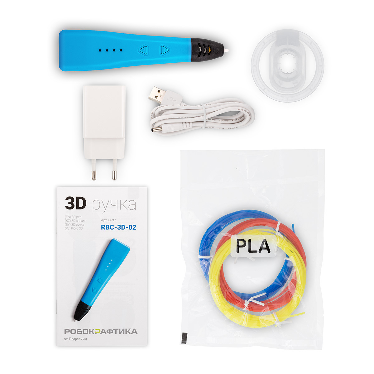 В комплекте: 3D-ручка, адаптер, USB-кабель, 3 мотка филамента PLA [по 3 м], руководство пользователя, пластиковая мини-отвертка [для регулировки температуры и снятия крышки регулятора].