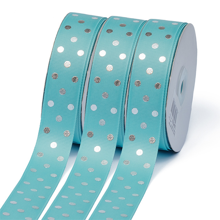Лента репсовая (в рубчик) Горошек серебро, 25 мм, LDRS331, 331 бирюзовый, уп. 27,4 м