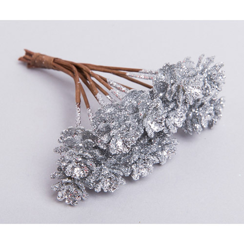 Шишки на проволоке с глиттером 2х2х10см, серебряный, 12 шт, 95216