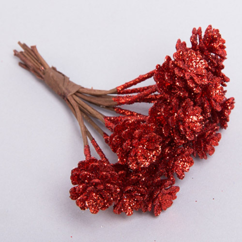 Шишки на проволоке с глиттером 2х2х10см, красный, 12 шт, 95217