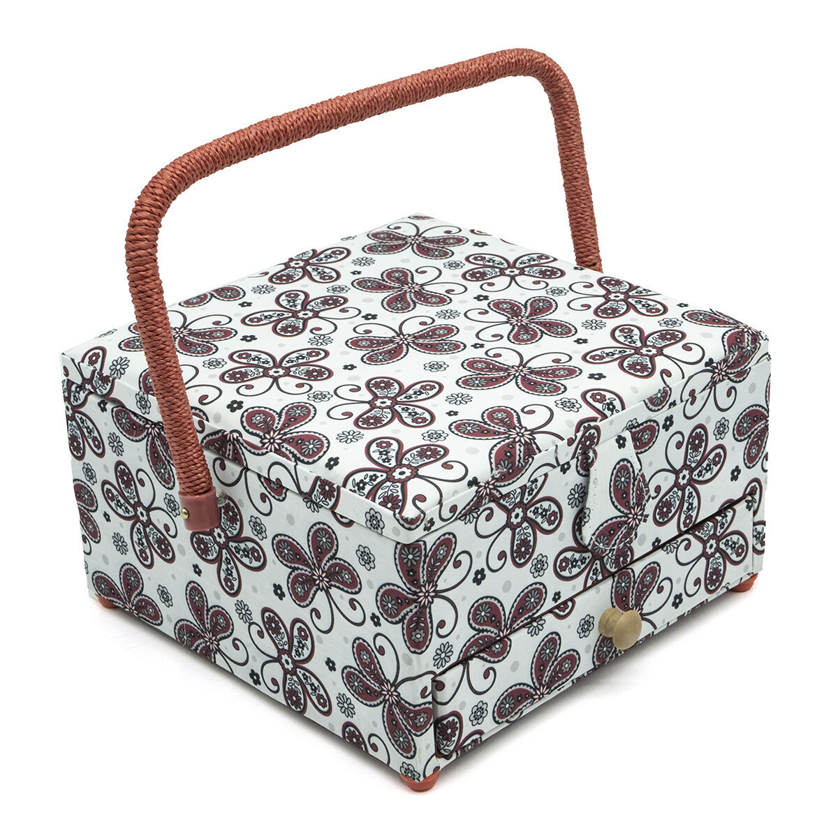 Шкатулка на каркасе снаружи обтянута яркой тканью с рисунком 'Красные бабочки'. Застегивается на кнопку, удобная большая ручка. Внутри находится вместительный отсек, выдвижной ящик с ручкой, кармашек для хранения мелочей и игольница-подушечка. Храните в этой шкатулке различные материалы и инструменты для рукоделия: – кружево, ленты, отрезы ткани; – пряжу или швейные нитки; – ножницы, портновские ножи; – вязальные крючки и спицы, булавки и швейные иглы; – пуговицы, бусины, стразы; – и многое другое. Шкатулку можно взять с собой, чтобы заниматься любимым хобби в отпуске или в гостях. Размер: 25х25х14,5 см.