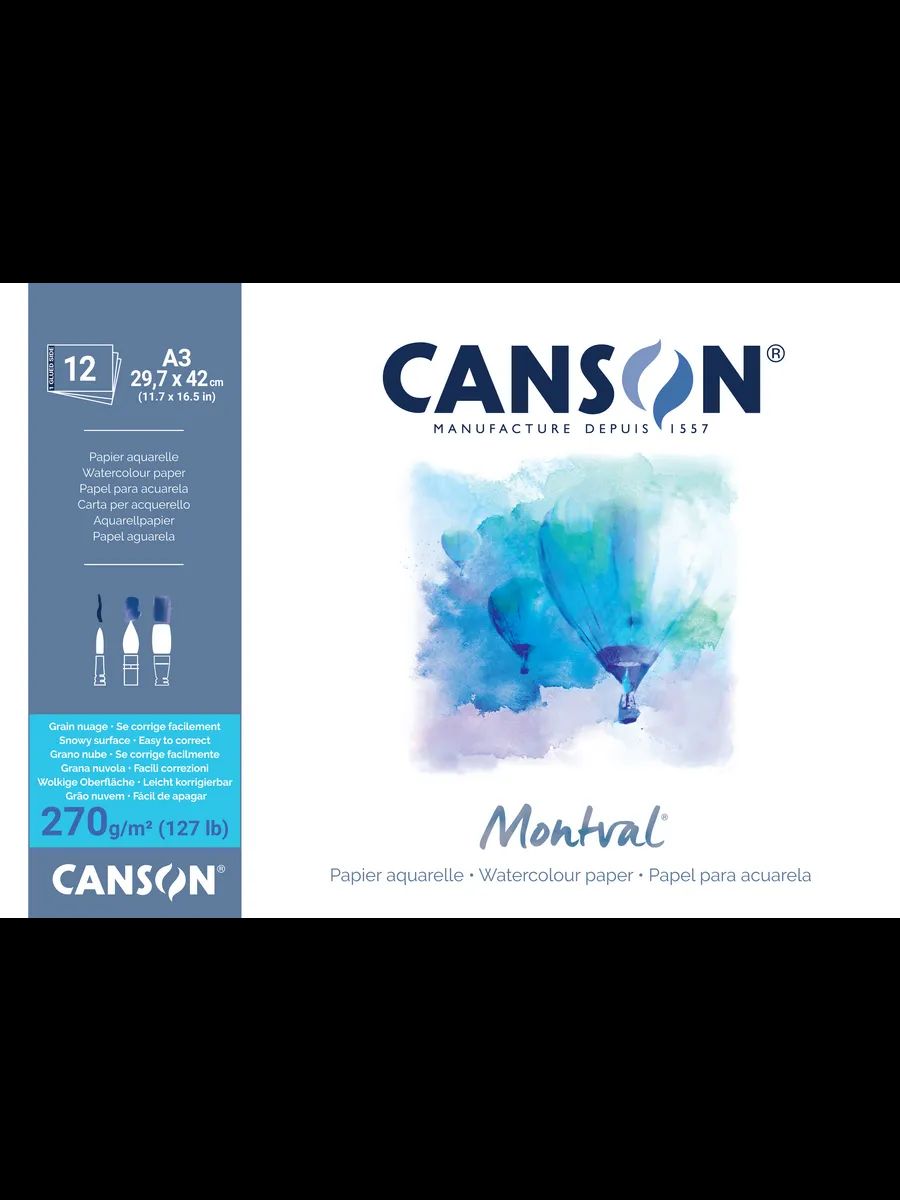 Альбом для акварели Montval 100% целлюлоза 270 г/м², A3 29.7х42 см, склейка с одной стороны 12 л, среднезернистая, Canson, C200807325