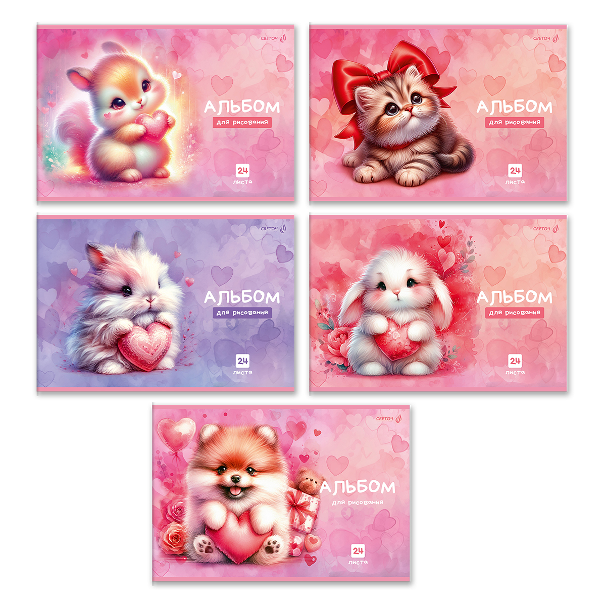 Альбом для рисования 100 г/м², A4 29.5х20.2 см, 24 л. на скобе 5 шт, 01696 Сердце в лапках, Светоч А254