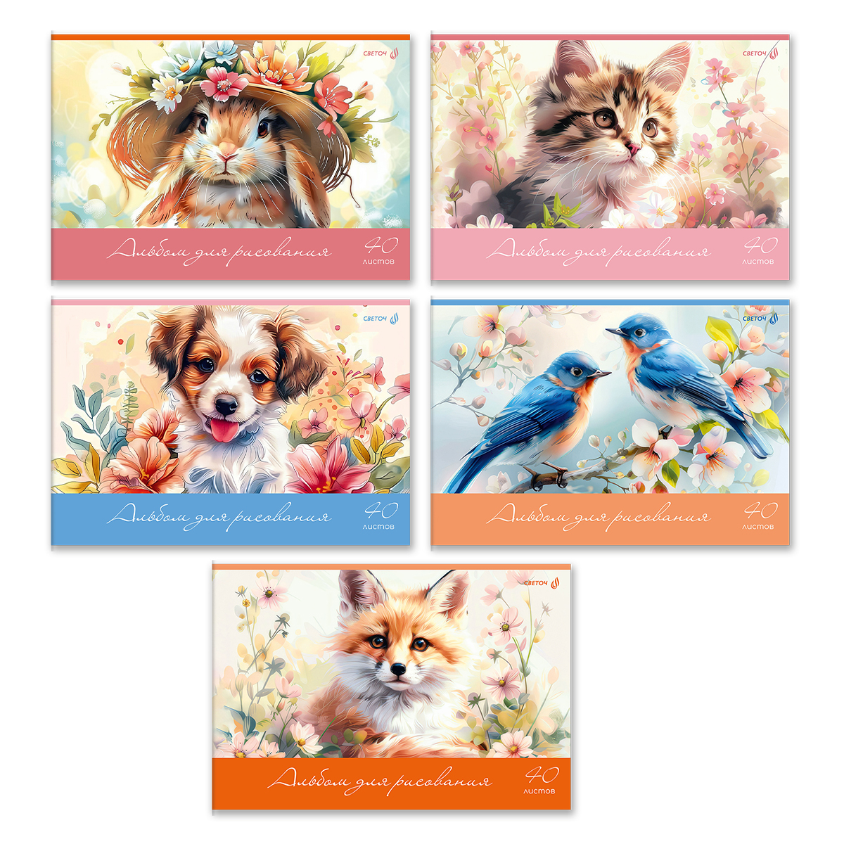 Альбом для рисования 100 г/м², A4 29.5х20.2 см, 40 л. на скобе 5 шт, 01711 Пушистые и пернатые, Светоч А258