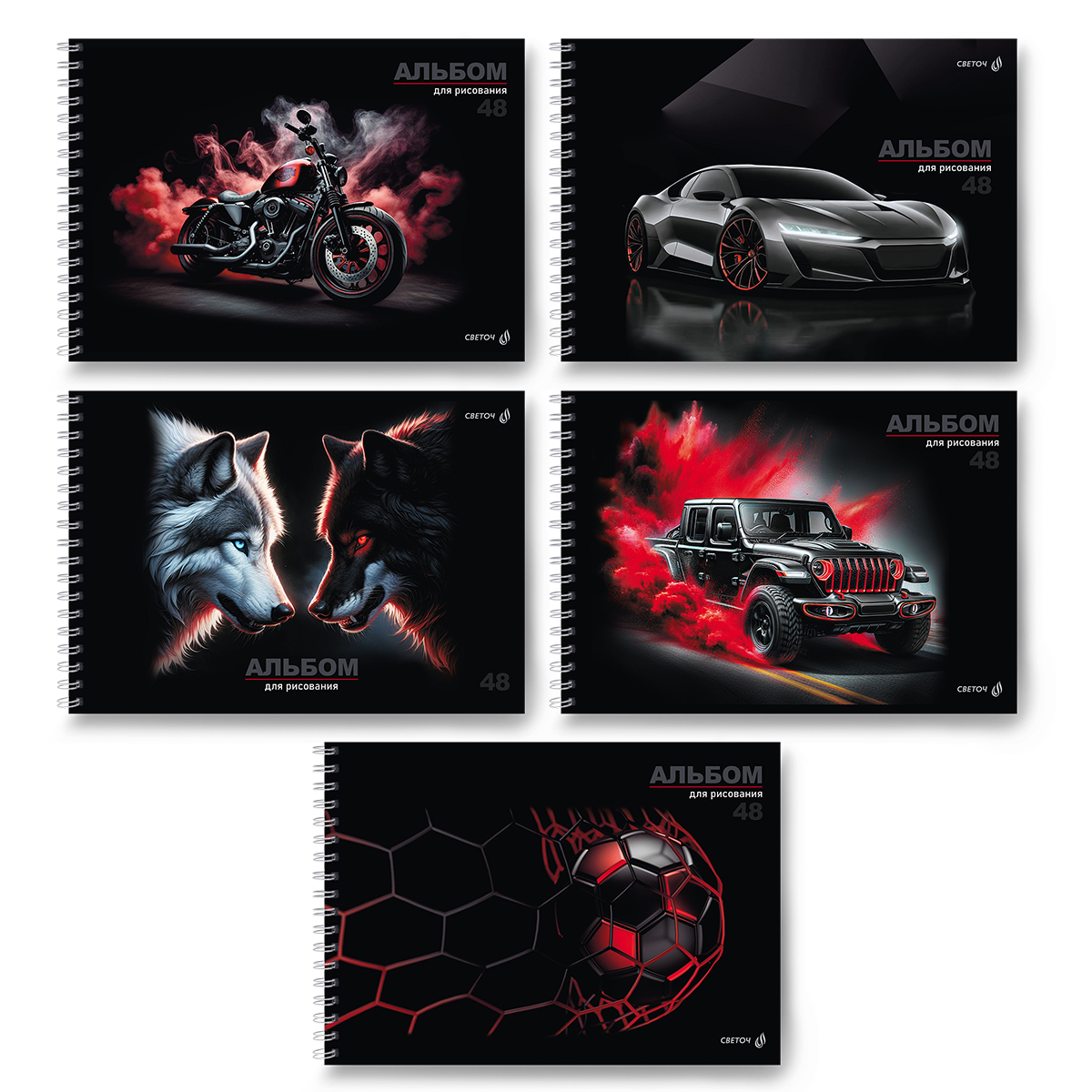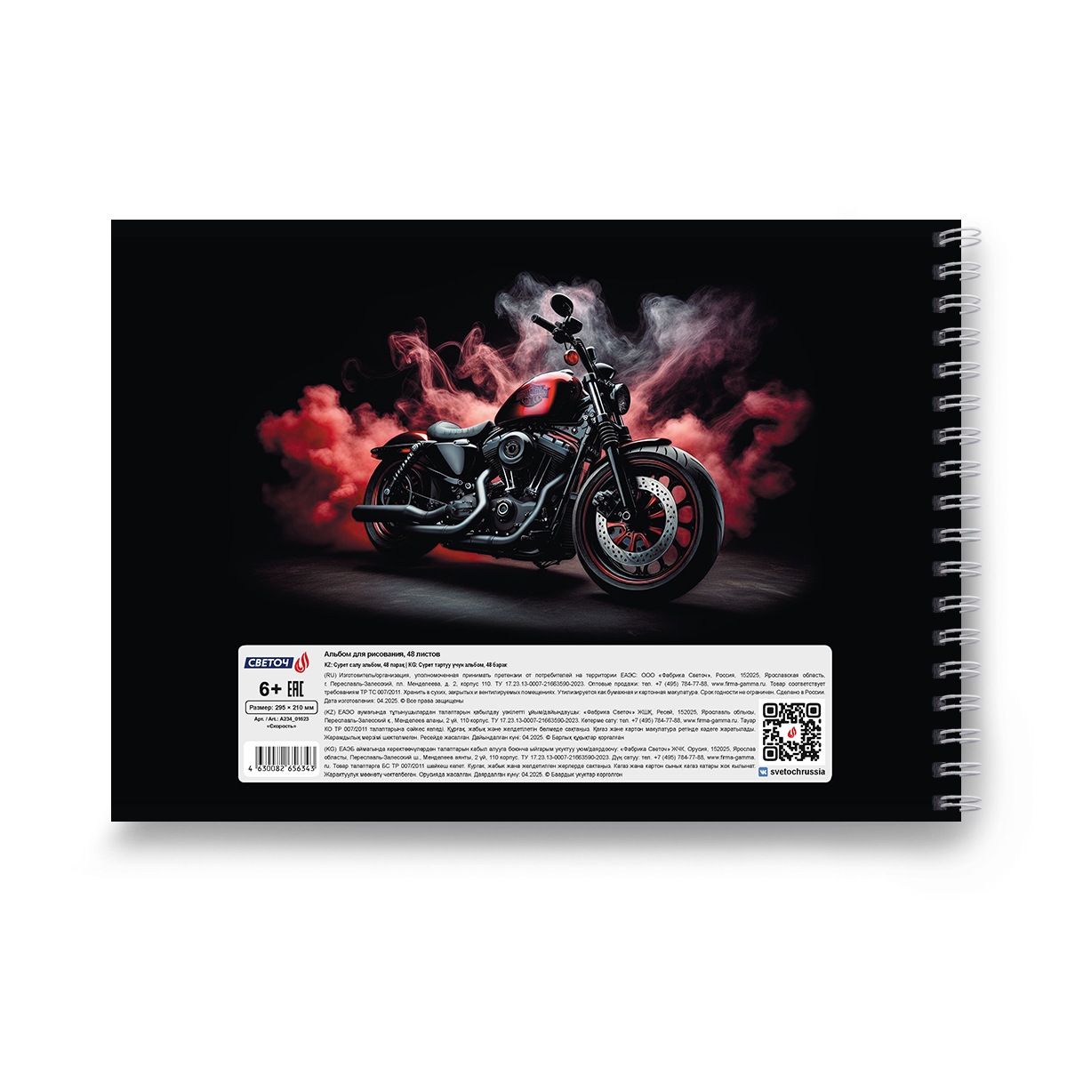 Формат А4. Вид скрепления - гребень. Обложка из мелованного картона плотностью 190 г/кв. м. Альбомы упакованы в термоусадочную пленку по 5 штук - 1 альбом каждого дизайна.