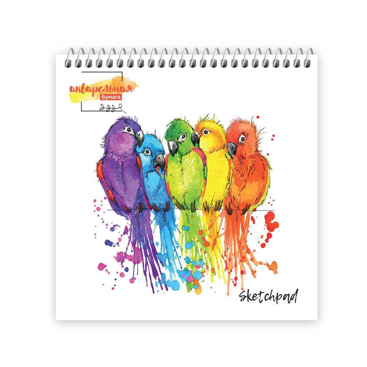 Альбом для рисования (скетчпад) с акварельной бумагой 200 г/м², 20х20 см, на спирали 20 л, 02_попугаи среднезернистая, Аква-колор IBWS-2020