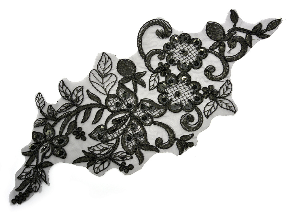 Пришивная кружевная аппликация с пайетками и бусинами уп., 2 шт, цв.01 черный 370x150 мм, Kruzhevo