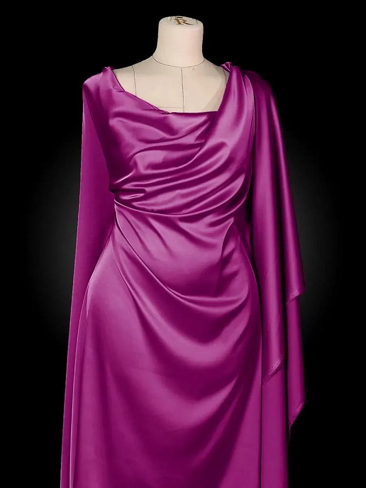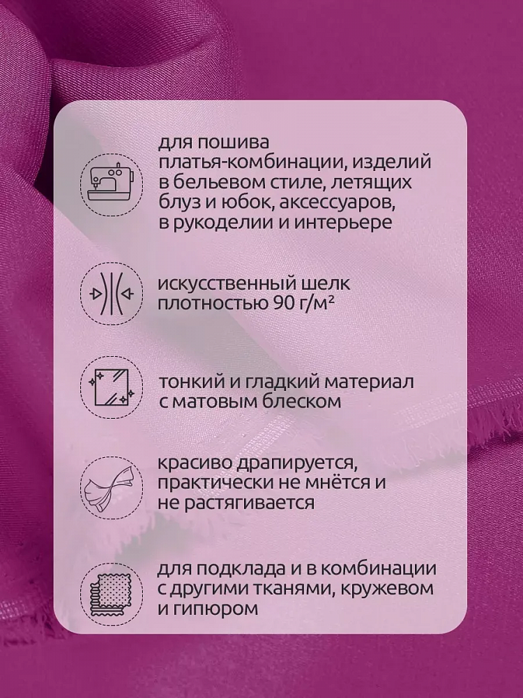 Армани шелк (искусственный шелк) - это синтетическая плательно-блузочная ткань, тонкая и нежная. Имеет приятную гладкую поверхность с матовым блеском, немного тянется в ширину полотна. Ткань красиво и легко драпируется, способна образовывать даже очень мелкие складки. Особенностью ткани является её близкое сходство по внешнему виду с натуральным шёлком. Идеален для пошива изделий в бельевом стиле и вечерних платьев, блузок, юбок, костюмов. Кроме того, это хороший вариант подклада под шифон, кружево или гипюр, используется для изготовления палантинов, платков и шарфиков. Светлые оттенки немного просвечивают.