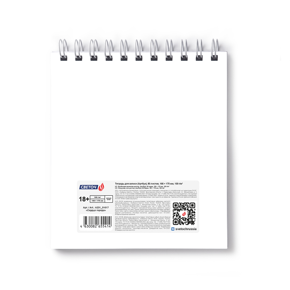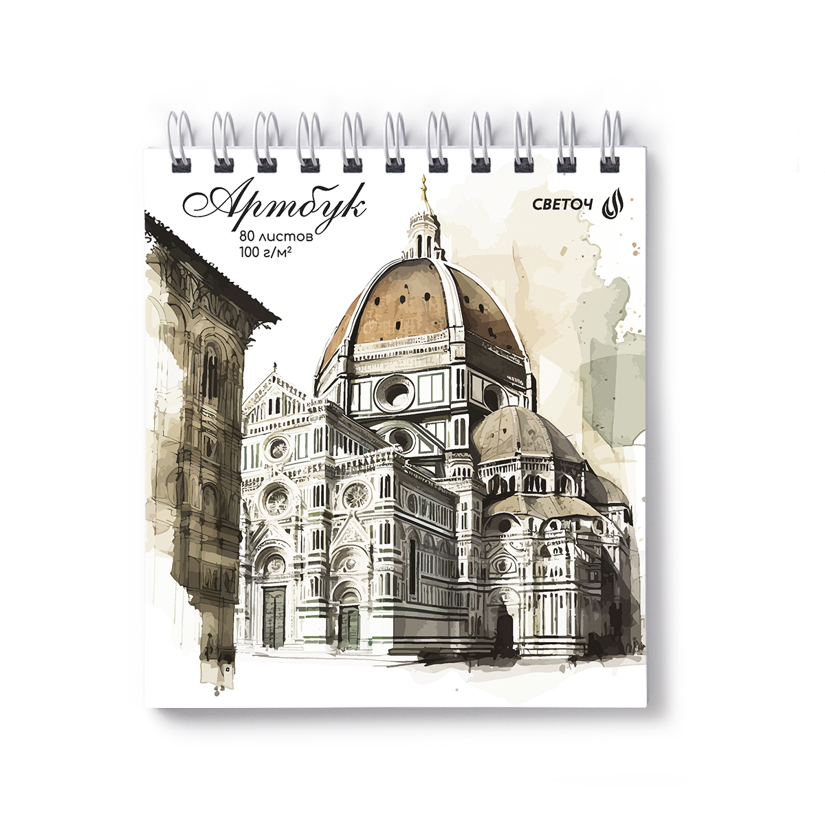 Артбук (скетчбук), блок белый, жесткая подложка, 100 г/м², 166х175 мм, на гребне 80 л. 2 шт, Сердце города 01617, Светоч А231
