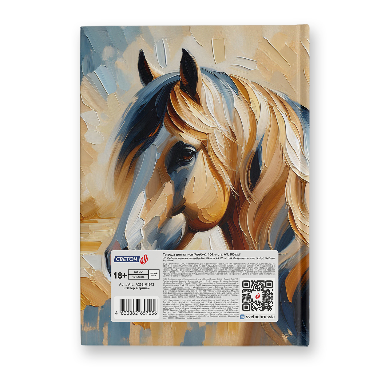 Артбук (скетчбук), глянцевая ламинация, блок белый, 7Бц, A5 100 г/м², сшивка 104 л. 4 шт, Ветер в гриве 01642, Светоч А238
