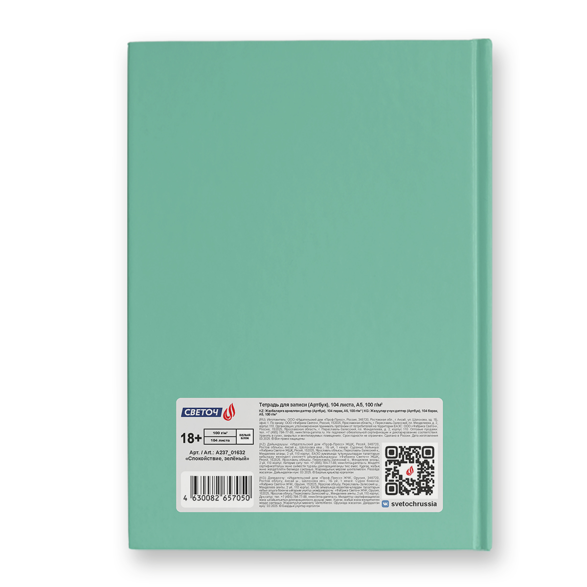 Артбук (скетчбук), матовая ламинация, блок белый, 7Бц, A5 100 г/м², сшивка 104 л. 4 шт, Спокойствие, зелёный 01632, Светоч А237