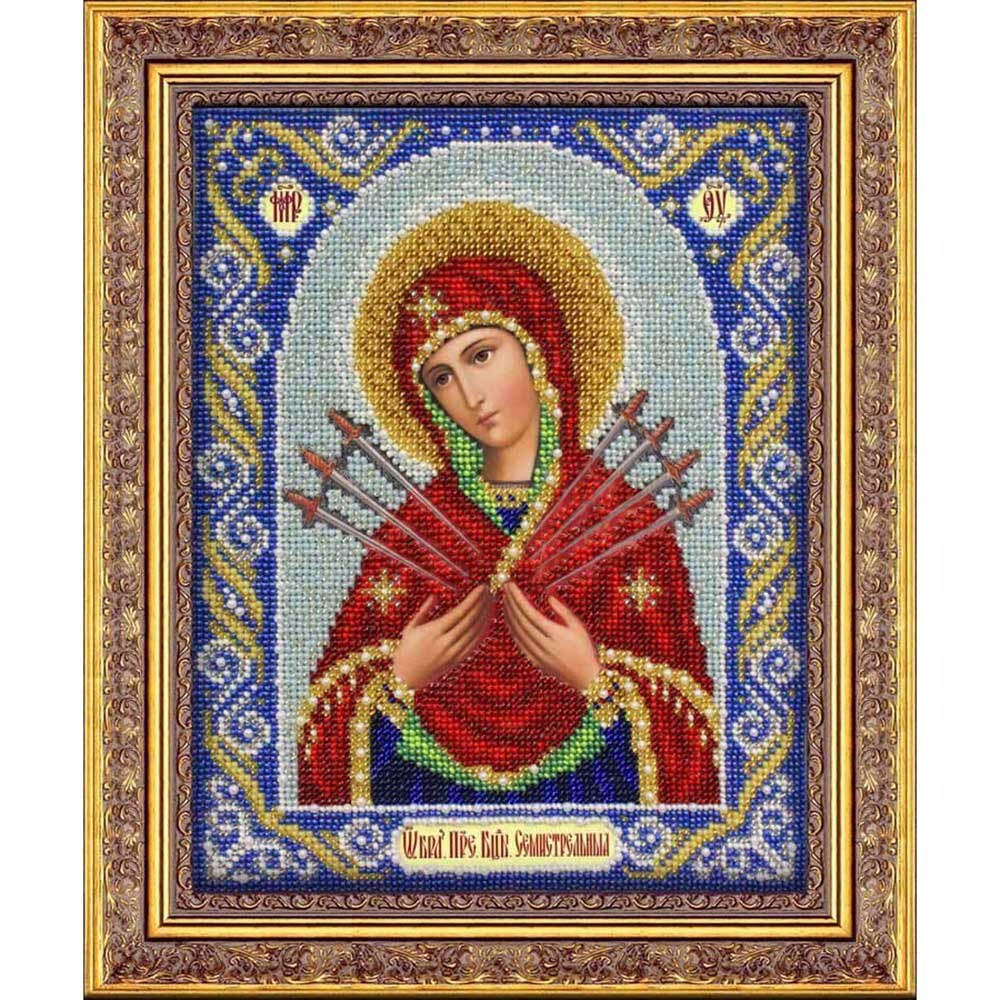 Бисер – традиционный материал для украшения икон. Его ценят за яркий блеск, многообразие цветовой палитры, долговечность. Икона Богородицы 'Семистрельная', расшитая бисером, займет почетное место в вашем домашнем иконостасе или станет прекрасным подарком верующему человеку. Работа выполнена по правилам церковной вышивки: бисером зашиваются отдельные участки, кроме лика, рук и надписей на иконе. Рекомендации: чтобы вышивка получилась аккуратной, используйте пяльцы. Ткань-основу не рекомендуется стирать, поэтому приступать к работе желательно с чистыми руками. Нитки для бисера и рамка не входят в комплект. В наборе: бисер Чехия, льняная ткань с нанесенным рисунком, бисерная игла, подробная инструкция. Количество цветов: 16.