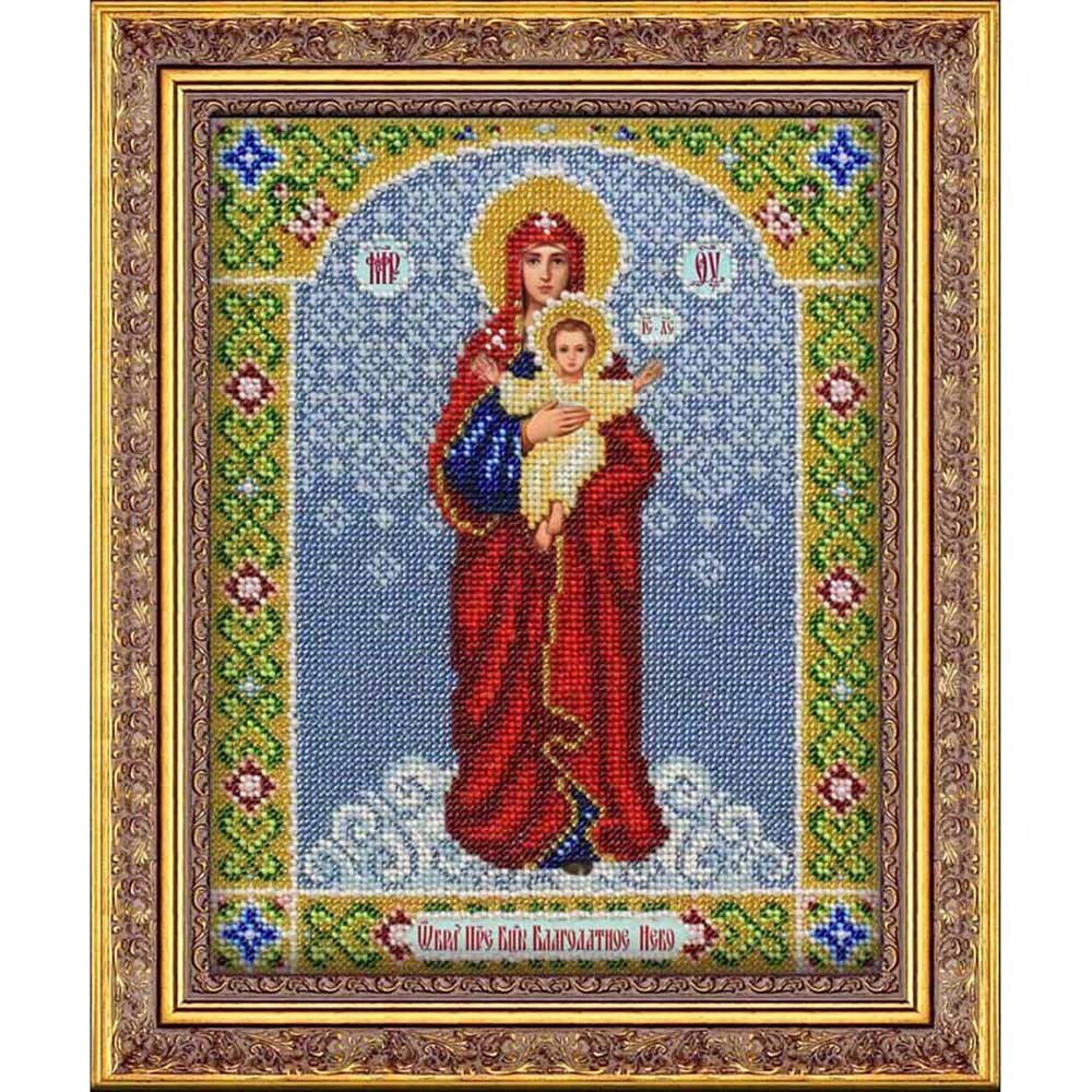 Бисер – традиционный материал для украшения икон. Его ценят за яркий блеск, многообразие цветовой палитры, долговечность. Икона Богородицы 'Благодатное небо', расшитая бисером, займет почетное место в вашем домашнем иконостасе или станет прекрасным подарком верующему человеку. Работа выполнена по правилам церковной вышивки: бисером зашиваются отдельные участки, кроме лика, рук и надписей на иконе. Рекомендации: чтобы вышивка получилась аккуратной, используйте пяльцы. Ткань-основу не рекомендуется стирать, поэтому приступать к работе желательно с чистыми руками. Нитки для бисера и рамка не входят в комплект. В наборе: бисер Чехия, льняная ткань с нанесенным рисунком, бисерная игла, подробная инструкция. Количество цветов: 17.