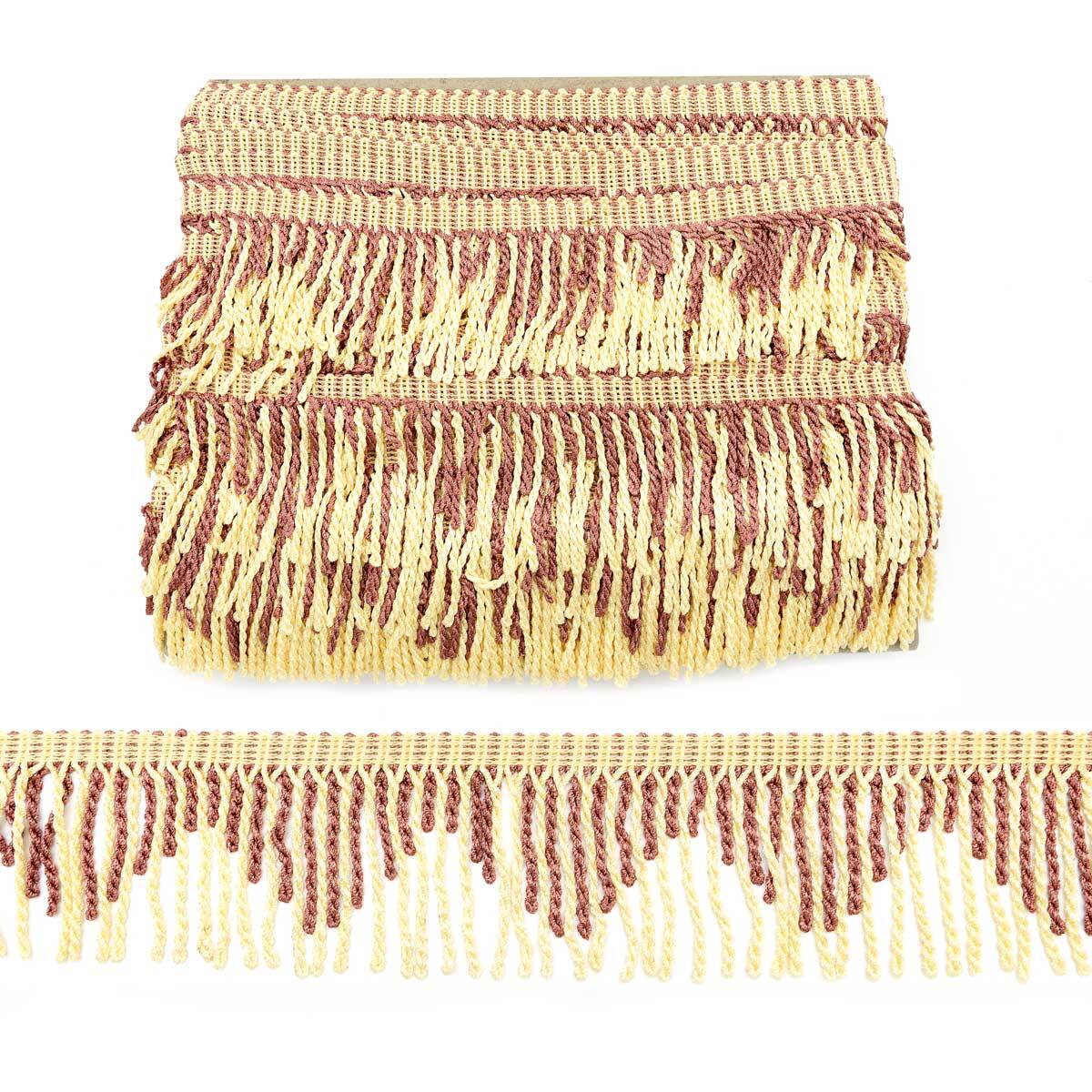 Бахрома представляет собой тесьму с кручеными нитями. Украсить такой бахромой можно не только шторы, но и покрывала, скатерти, подушки и многое другое. С помощью этого простого элемента можно оживить самую простую, скучную ткань, придать ей изящества и стиля. Работать с бахромой просто. Каждая рукодельница сможет пришить бахрому по краю изделия. Бахрома идеально подойдет для отделки штор в спальне или гостиной. Обновите любимые предметы интерьера, создайте свой неповторимый стиль, порадуйте себя красивыми и вещами. Размер: ширина 9 см. Цвет: бордо/св. золотой. Материал текстиль.