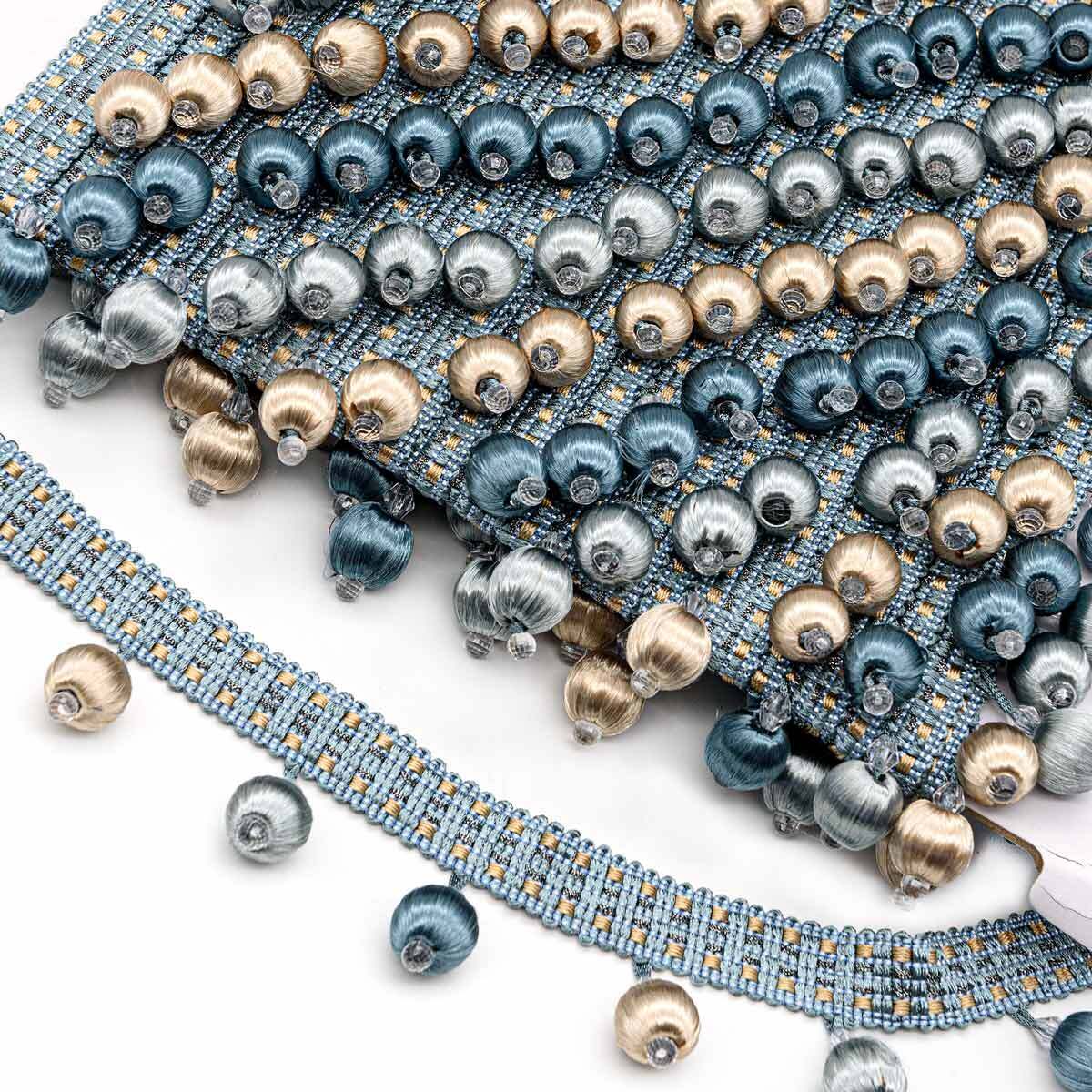 Бахрома-кант лучше всего подходит для отделки штор, гардин. Тонкий ряд из шариков-бубенчиков на тесьме пришивают к шторам, чтобы создать контрастные линии, расставить композиционные акценты, придать шторам более торжественный облик. Шторы с кантом из бубенчиков удачно впишутся в интерьер с 'дворцовым' стилем – барокко, рококо, классический. Кант с бубенчиками используют также для отделки одежды для выступлений, украшения оригинальных блокнотов и альбомов в технике скрапбукинга. Размер: длина ленты 12 м, ширина 5 см, диаметр элементов 1,5 см. Цвет: светло-бежевый/бирюзовый/светло-серый.