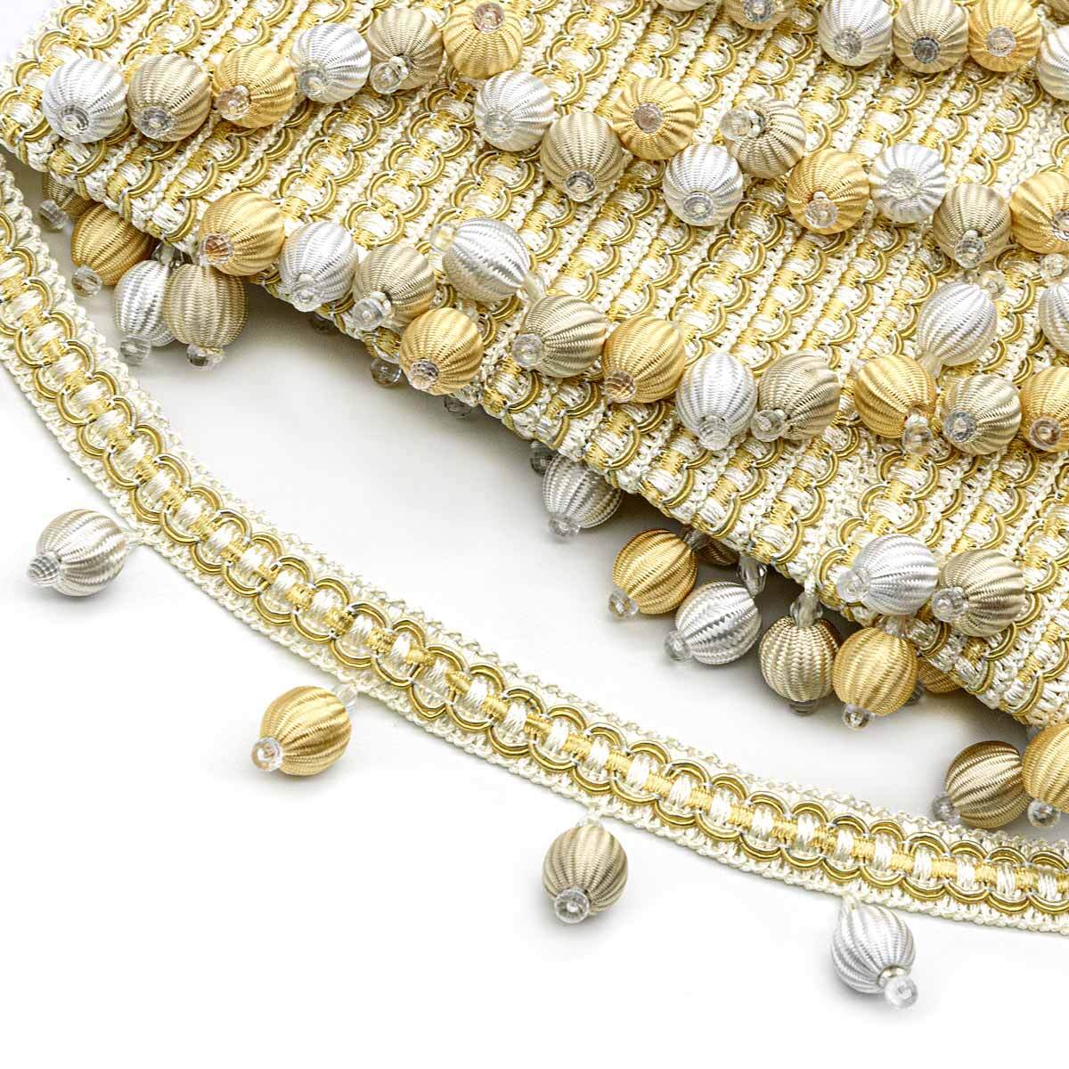 Бахрома-кант лучше всего подходит для отделки штор, гардин. Тонкий ряд из рифленых шариков на тесьме пришивают к шторам, чтобы создать контрастные линии, расставить композиционные акценты, придать шторам более торжественный облик. Шторы с кантом из бубенчиков удачно впишутся в интерьер с 'дворцовым' стилем – барокко, рококо, классический. Кант с бубенчиками используют также для отделки одежды для выступлений, украшения оригинальных блокнотов и альбомов в технике скрапбукинга. Размер: длина ленты 12 м, ширина 5 см, диаметр элементов 1,5 см. Цвет: молочный/светло-бежевый/светлое золото.