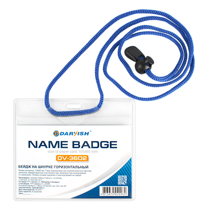 Горизонтальный бейдж предназначен для визиток, фотографий, идентификационных карт. Важный элемент для конференций и других мероприятий. Для регулировки длины на шнурке предусмотрен фиксатор-ограничитель. Надевается на шею. Важная деталь для проведения конференций, форумов и других очных мероприятий. Размер бейджа: 105х60 мм. Длина шнурка: 105 см. Продукция Darvish – это огромный ассортимент, который удовлетворяет запросы широкого круга потребителей, и конкурентоспособные цены.