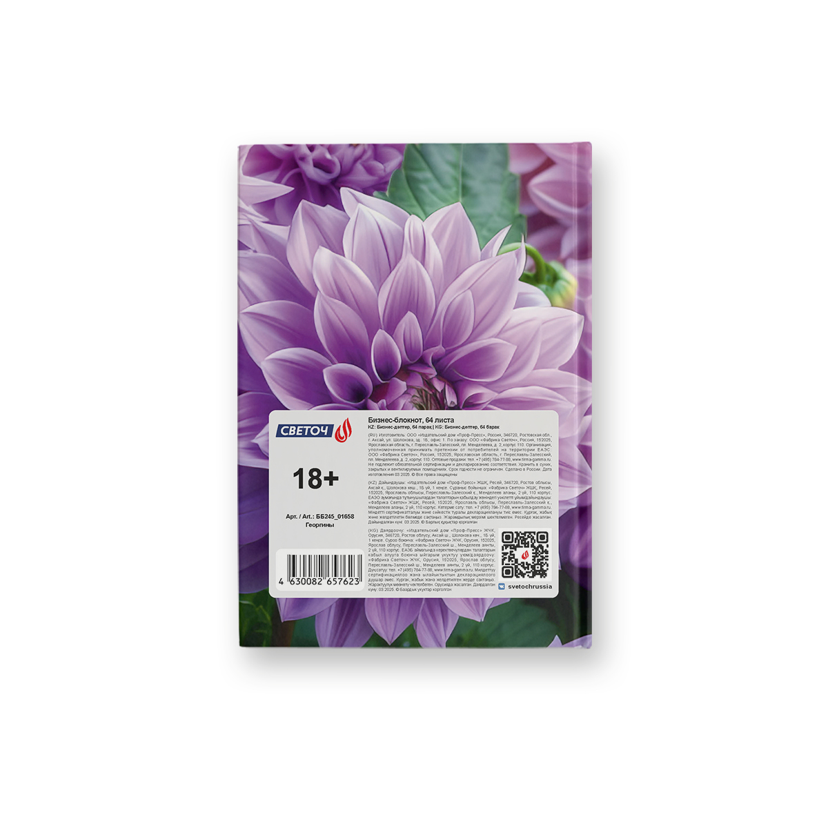 Бизнес-блокнот, матовая ламинация, ББ245 A6 64 л. 4 шт клетка, Георгины 01658, Светоч