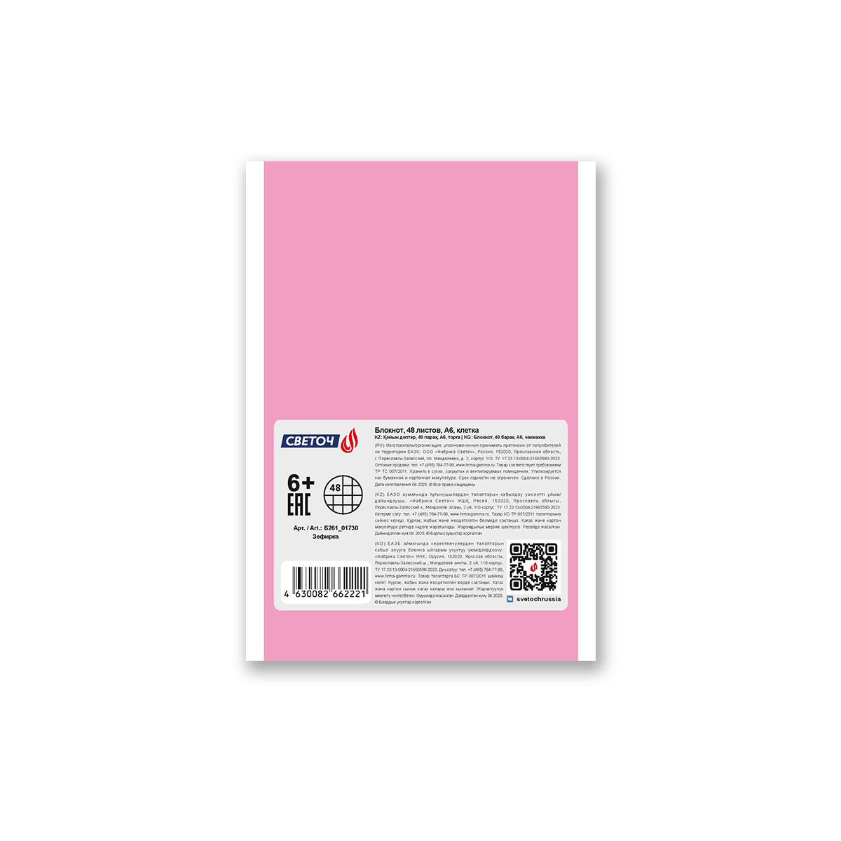 Блокнот на скобе, A6 48 л. 10 шт клетка, Зефирка 01730, Б261 Светоч