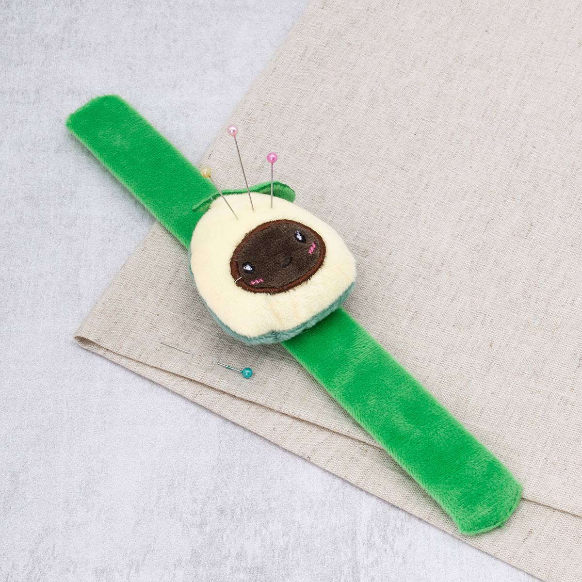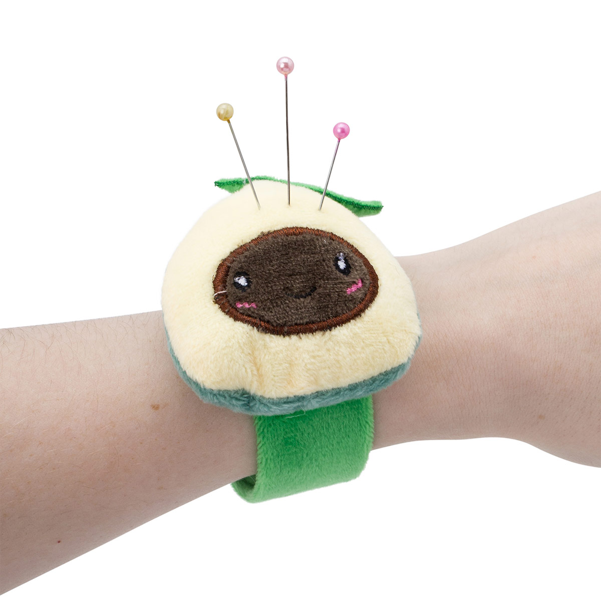 Игольница мягкая на браслете - незаменимый помощник для всех, кто увлекается шитьём, рукоделием и творчеством. Игольница на руку позволяет держать необходимые иголки и булавки буквально на себе. Браслет оснащён гибким плюшевым ремешком длиной 24 см с надёжным фиксатором, который обеспечивает комфортную посадку без использования застёжек. Модель браслета-игольницы подходит для любого обхвата руки благодаря продуманной системе крепления. На ремешок прикреплена мягкая подушечка в виде авокадо, способная удерживать иголки и булавки. Сама подушечка выполнена из качественного материала, отличающегося износостойкостью. Внутри мягкой подушечки находится наполнитель из синтепона. Иголки и булавки надёжно фиксируются в материале, при этом подушечка сохраняет первоначальную форму даже при длительном использовании. Игольница на руку значительно упростит рабочий процесс: она очень удобна при кройке и примерке изделий. Необычный дизайн игольницы подойдет взрослым и детям. Этот милый швейный аксессуар станет хорошим и практичным подарком маме, бабушке, подруге или коллеге. Плюшевая игольница сохранит все ваши иголки в целости и поможет поддержать порядок в процессе работы.