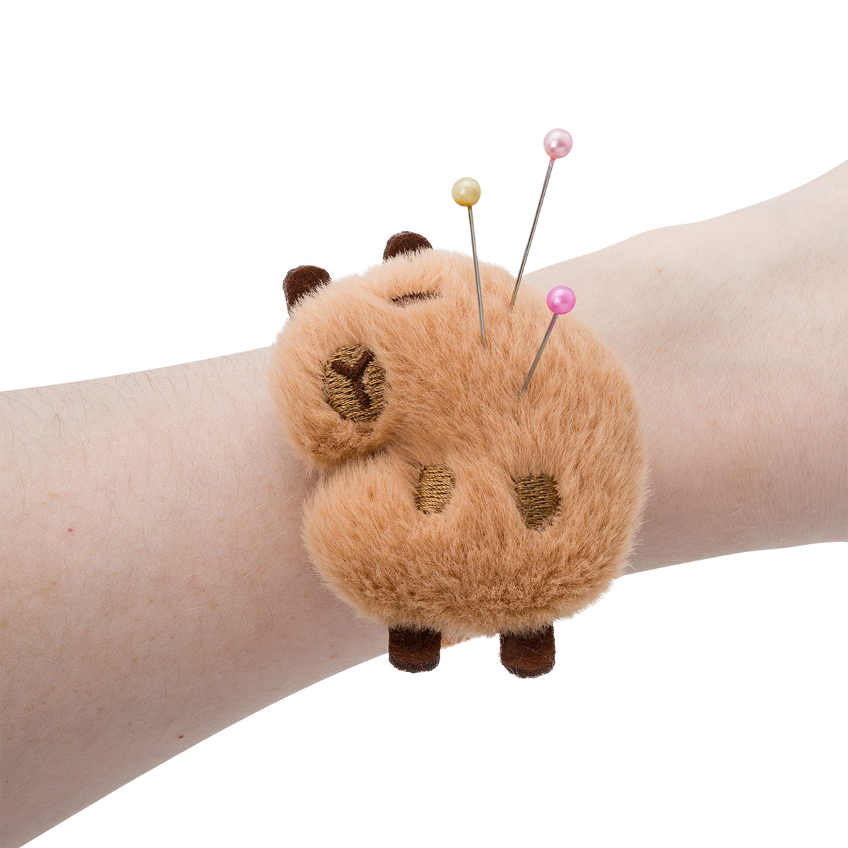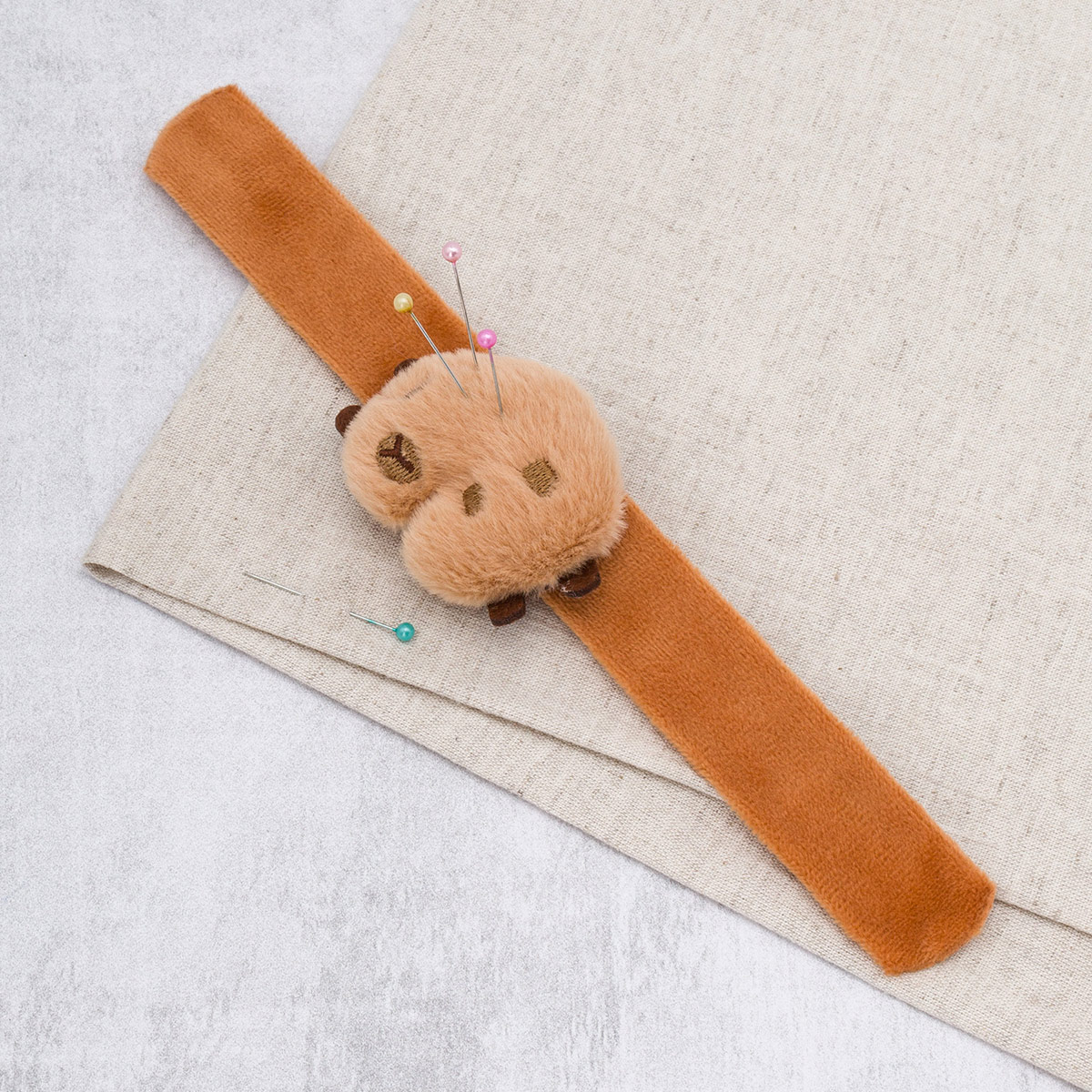Игольница мягкая на браслете - незаменимый помощник для всех, кто увлекается шитьём, рукоделием и творчеством. Игольница на руку позволяет держать необходимые иголки и булавки буквально на себе. Браслет оснащён гибким плюшевым ремешком длиной 24 см с надёжным фиксатором, который обеспечивает комфортную посадку без использования застёжек. Модель браслета-игольницы подходит для любого обхвата руки благодаря продуманной системе крепления. На ремешок прикреплена мягкая подушечка в виде капибары, способная удерживать иголки и булавки. Сама подушечка выполнена из качественного материала, отличающегося износостойкостью. Внутри мягкой подушечки находится наполнитель из синтепона. Иголки и булавки надёжно фиксируются в материале, при этом подушечка сохраняет первоначальную форму даже при длительном использовании. Игольница на руку значительно упростит рабочий процесс: она очень удобна при кройке и примерке изделий. Необычный дизайн игольницы подойдет взрослым и детям. Этот милый швейный аксессуар станет хорошим и практичным подарком маме, бабушке, подруге или коллеге. Плюшевая игольница сохранит все ваши иголки в целости и поможет поддержать порядок в процессе работы.