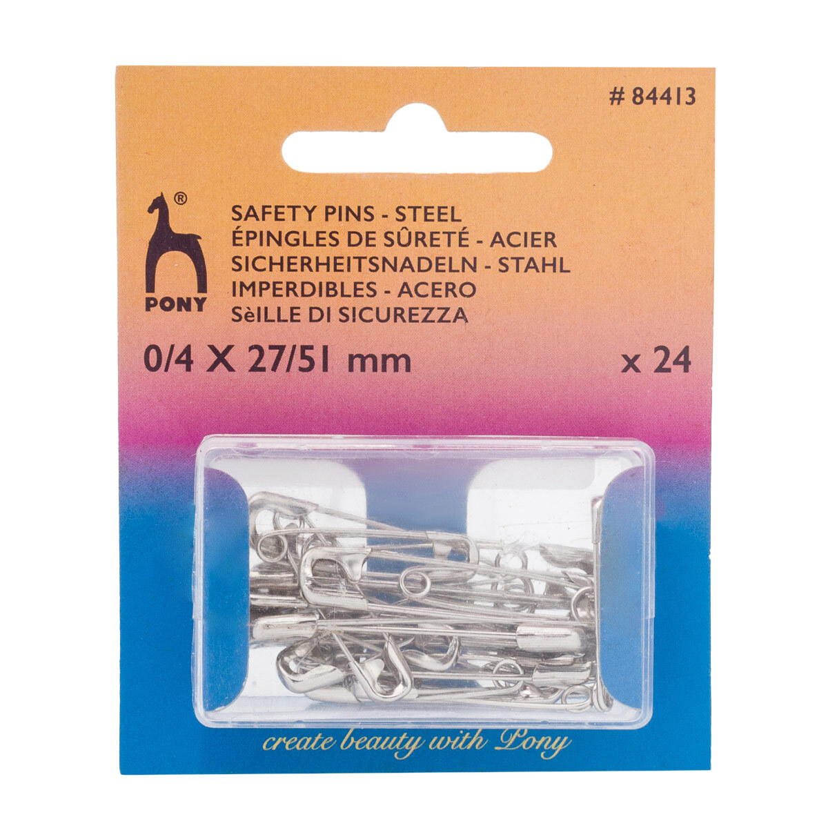 Безопасные закрытые английские булавки PONY. Изготовлены из стали, устойчивы к коррозии. Это наиболее популярный вид булавок, который широко используется в быту, при шитье одежды или примерке. Важная деталь в творчестве и быту. С помощью английских булавок можно решить множество задач: скрепить детали выкройки перед примеркой или наложением строчки, зафиксировать отложенные петли, продеть резинку через кулиску, оформить драпировку штор и т.д. Поставляются в блистере. В наборе 24 штуки, размер 21/51 мм. PONY (Индия) – бренд с более чем полувековой историей, представленный на многих мировых рынках. Продукция бренда привлекает внимание действительно широким ассортиментом, доступными ценами и качеством материалов.