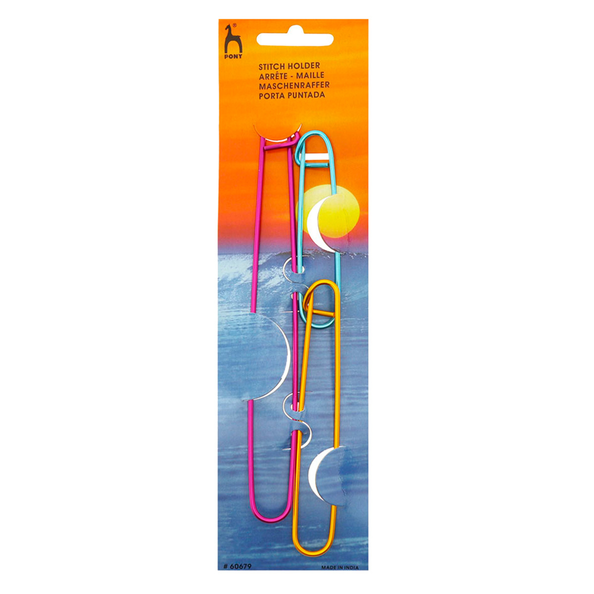 Набор Pony 'Stitch Holder', включающий в себя 3 алюминиевые булавки разных цветов и размеров, служит в качестве вспомогательного инструмента для временного снятия группы петель с основной спицы при вязании сложных переплетающихся узоров. Инструменты внешне напоминают классическую английскую булавку. Благодаря 'запирающейся' конструкции, Stitch Holder является отличной альтернативой обычной прямой спице: временно незадействованные петли остаются на месте и сохраняют свою форму до тех пор, пока не понадобится их участие в очередном этапе создания узора. Длина: 80 мм, 110 мм, 170 мм