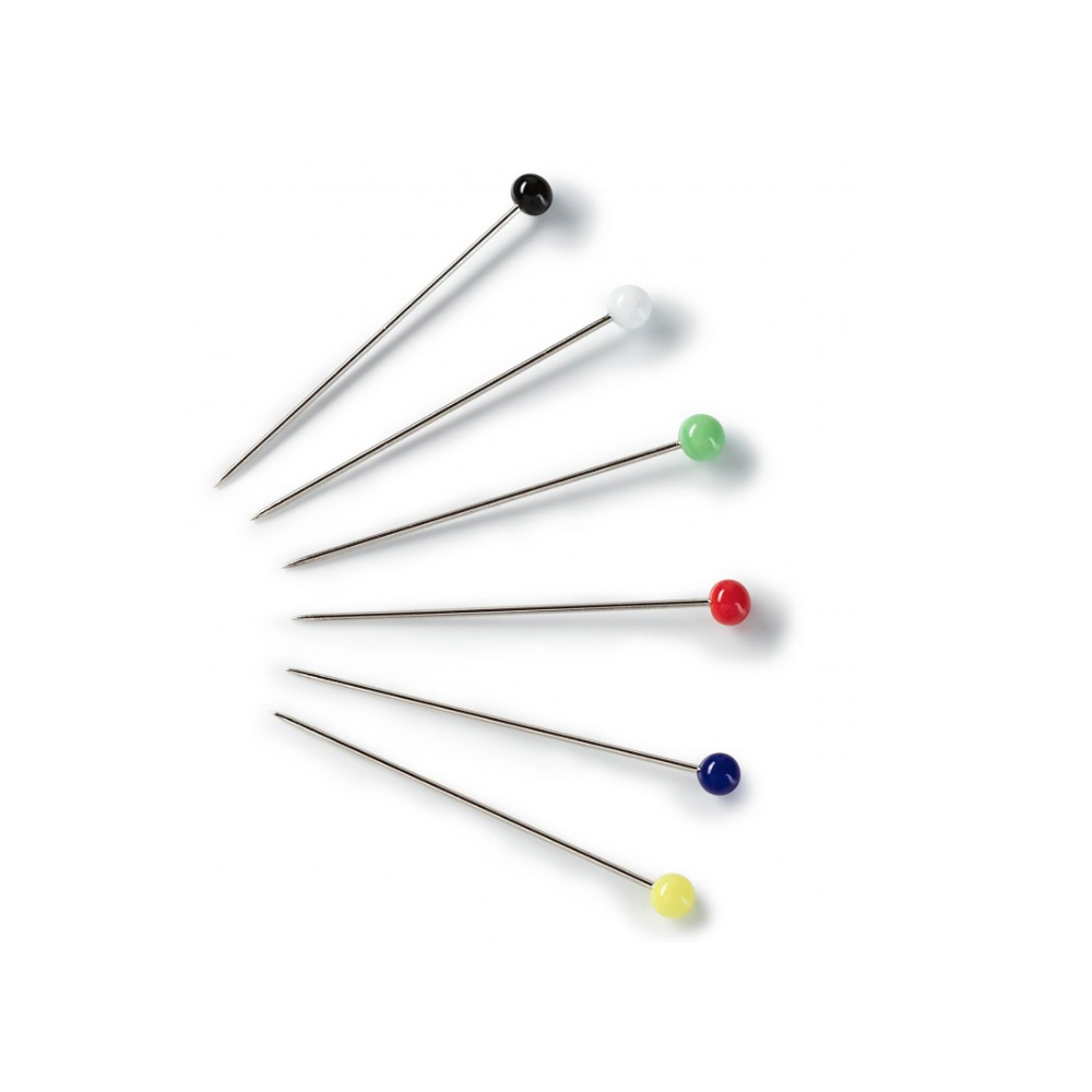 Иглы имеют яркие стеклянные головки. Предназначены для точного соединения деталей, подойдут для закалывания при шитье и крое. Булавки имеют термоустойчивые стеклянные головки, по ним можно проглаживать утюгом, поэтому они удобны для наметки, квилтинга и пэчворка.