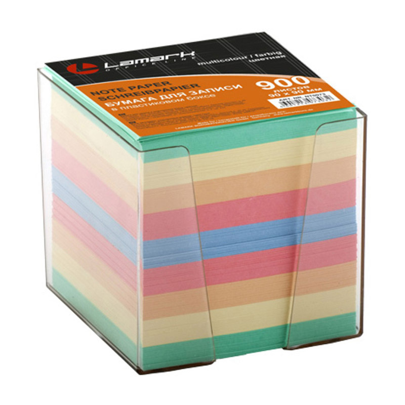 Бумага для записи 90х90мм 900л цветная в прозр. пластик. боксе
