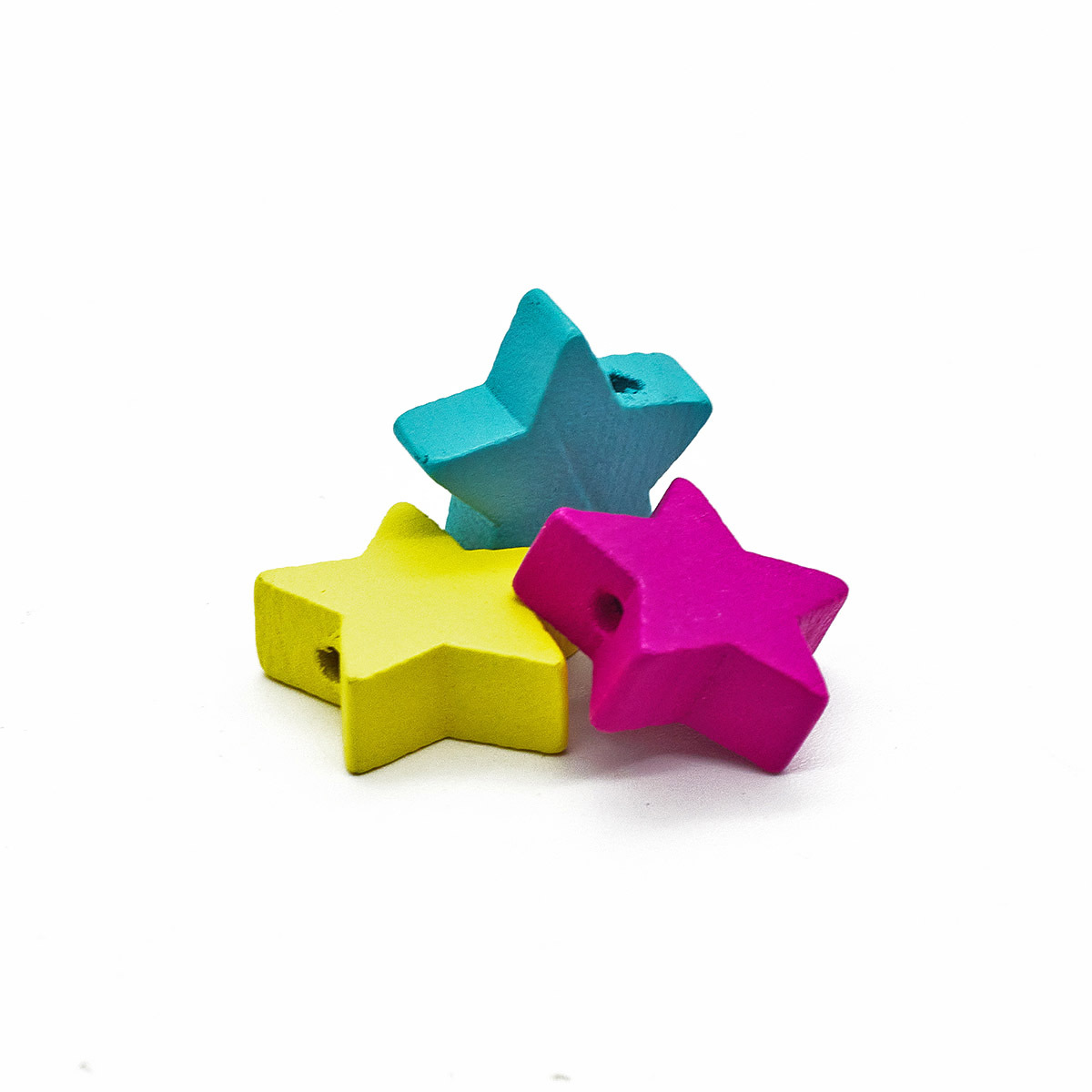 Деревянные бусины в виде звездочек – прекрасная основа для создания авторских украшений. Дерево – натуральный и экологичный материал. Из деревянных бусин можно смело создавать детскую бижутерию, развивающие игрушки и многое другое. Фигурные бусины окрашены в яркие цвета и удачно вписываются в разные стили. Несколько идей: – подберите шнур/леску и сделайте оригинальное украшение: бусы, браслет или колье; – создайте авторскую подвеску на рождественскую елку; – смастерите развивающую игрушку для детей. Размер бусины: 20 мм. Количество в упаковке: 20 г.
