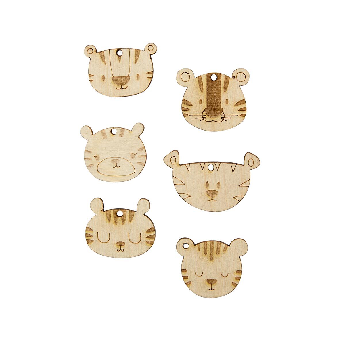Набор деревянных заготовок 'Тигры' – основа для ваших творческих проектов. Сделайте из этих фигурок оригинальные поделки, например: – подарочный магнит на холодильник; – бирку для связки ключей; – украшение-подвес на елку, – элемент для декоративного панно. Фигурки изготовлена из тонкой березовой фанеры. Фанерные заготовку можно оформить в технике декупажа, расписать акриловыми красками, покрыть блестками. Чтобы фанера не деформировалась от влаги, ее обрабатывают лаком или воском. Рекомендации по хранению: хранить в сухом месте (рекомендуемая влажность воздуха 40-60%) при температуре от 18 до 25 градусов Цельсия. Размеры заготовок: 35x30x3 мм, 35x35x3 мм, 40x35x3 мм, 50x35x3 мм. Количество в упаковке: 6 штук.