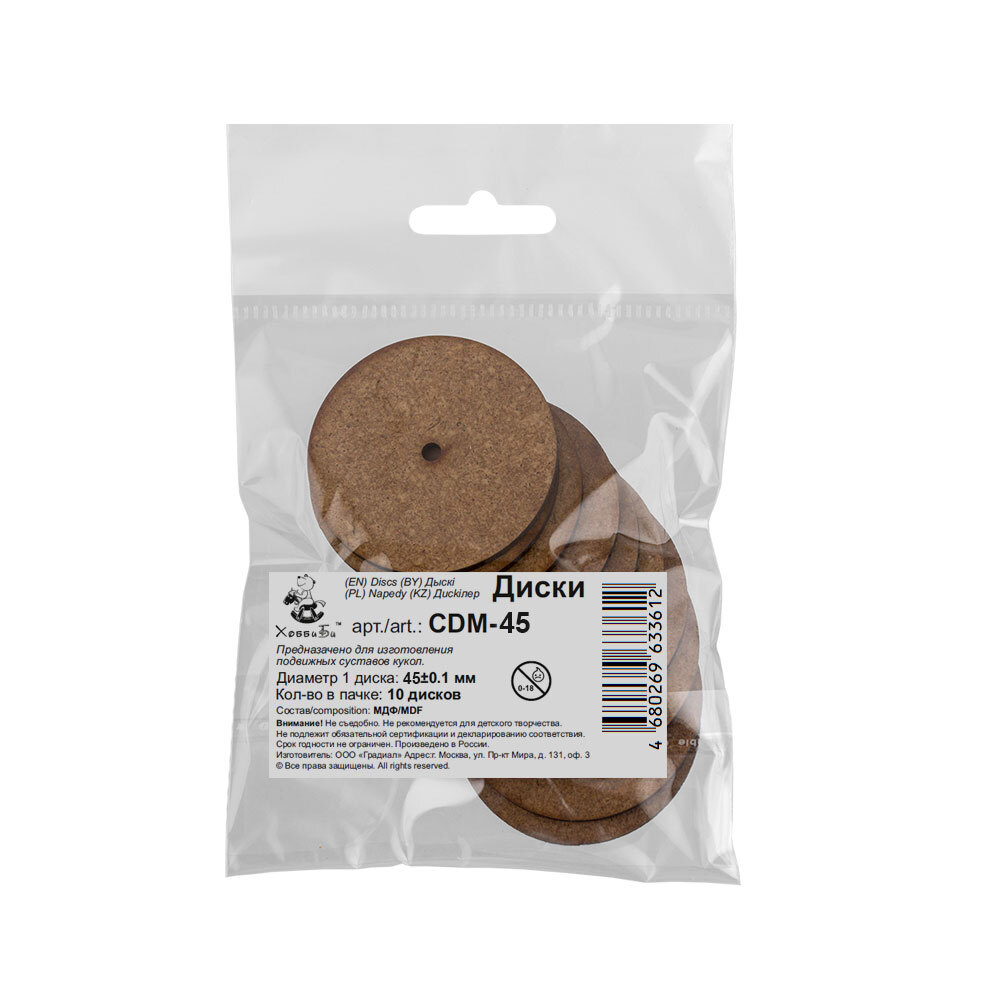 Диски из прессованной древесины ТМ "HobbyBe" артикул CDМ-45 - прочные, отлично подойдут для создания мишек Тедди и авторских игрушек. Диски крепкие, износостойкие. Благодаря креплениям с такими дисками игрушка будет долго радовать вас своим первоначальным видом.
