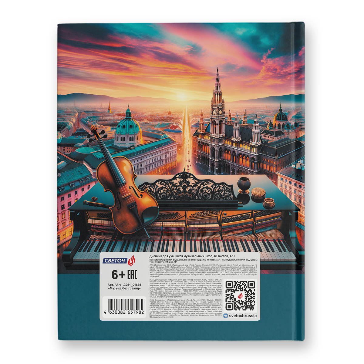 Дневник для музыкальных школ, глянцевая ламинация, твердый переплет Д251 A5 48 л. 4 шт сшивка 60 г/м², Музыка без границ 01685, Светоч