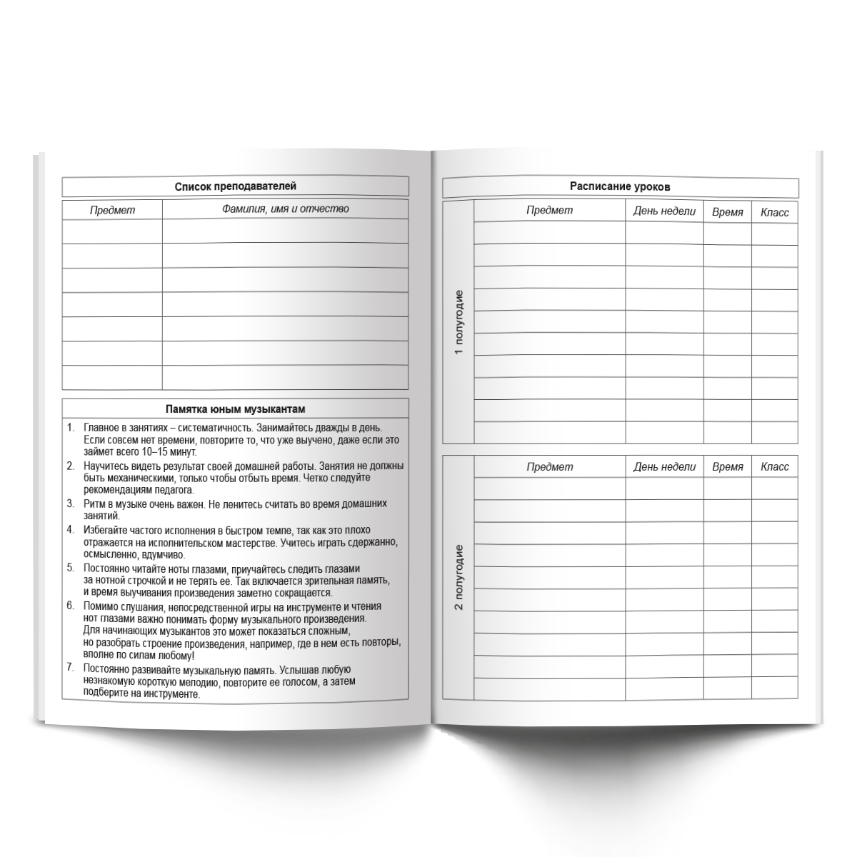 Дневник для музыкальных школ незаменимый помощник в планировании и контроле учебного процесса для юного музыканта. Дневник наполнен информацией о расписании занятий, репертуарного плана, расписанием участия в конкурах и концертах. Содержит профильный справочный материал.