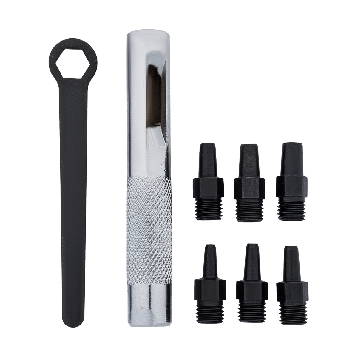 Дырокол-пробойник, в наборе 6 насадок, прилагается ключ. Подходит для натуральной или искусственной кожи, картона, тонкого пластика, тентовой ткани. Дырокол используют при установке люверсов, кнопок, декоративной фурнитуры. Полезный инструмент для тех, кто занимается шитьем и ремонтом верхней одежды, сумок, обуви. Инструкция: вкрутите в ручку (шток) пробойник нужного диаметра с помощью ключа, затем установите пробойник на месте, где будет располагаться отверстие. Отверстие создается путем удара молотка по штоку. Размер: диаметр 2, 2,5, 2,8, 3,2, 4, 4,8 мм.