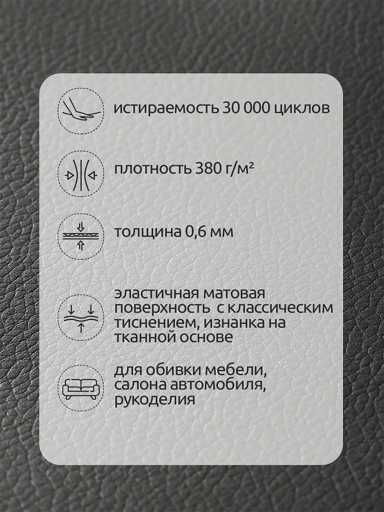 Матовая экокожа NICE выполнена на тканной полиэстеровой основе, эластичная и приятная на ощупь, тиснение классическое. Современный, прочный и устойчивый к внешним воздействиям кожзам, он отвечает самым высоким требованиям эксплуатации, устойчив к механическим и световым воздействиям, легко чистится, хорошо сохраняет окраску и не теряет внешний вид долгие годы. Коллекция искусственной кожи это не просто имитация кожи - это идеальный компаньон к большинству коллекций мебельных тканей.