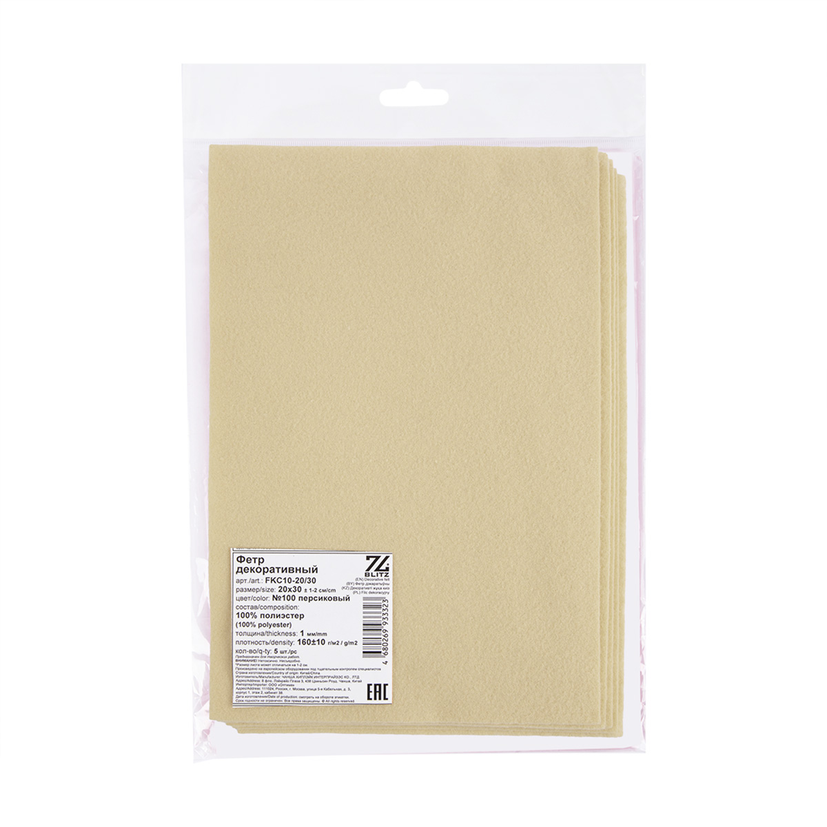 Фетр листовой 1 мм, 20х30 см, 5 шт, 075 молочный, Blitz FKC10-20/30
