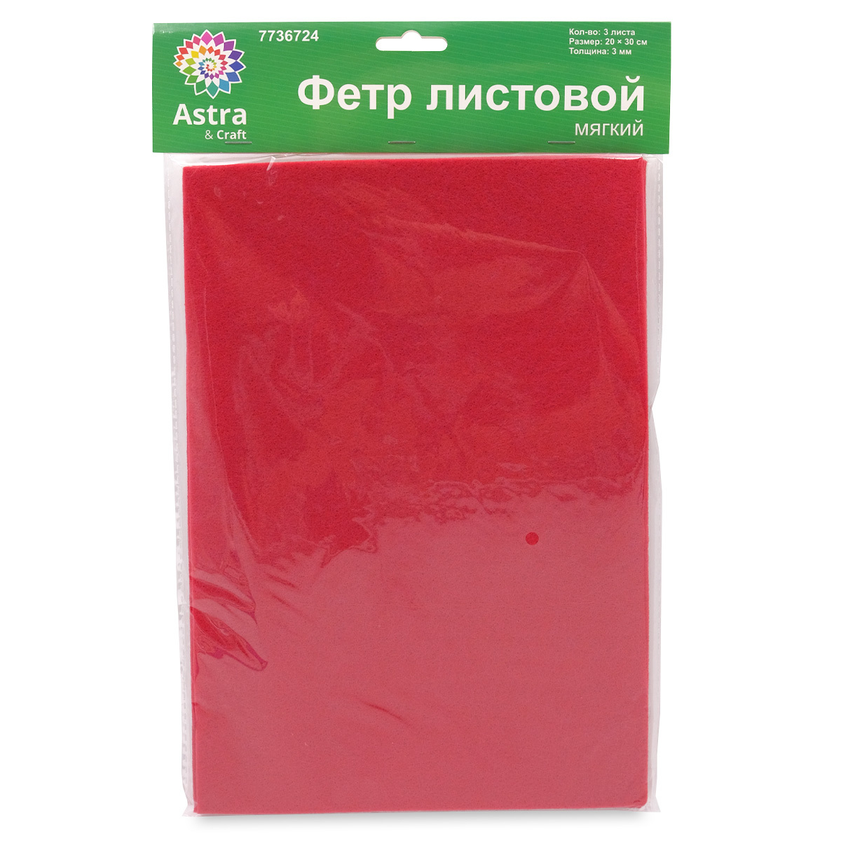 Фетр листовой мягкий 3.0 мм, 400гр, 20х30см, 3 штук Astra&Craft (AF803/YF604 ярко-красный)