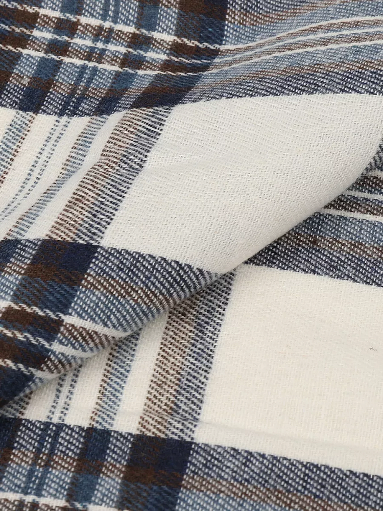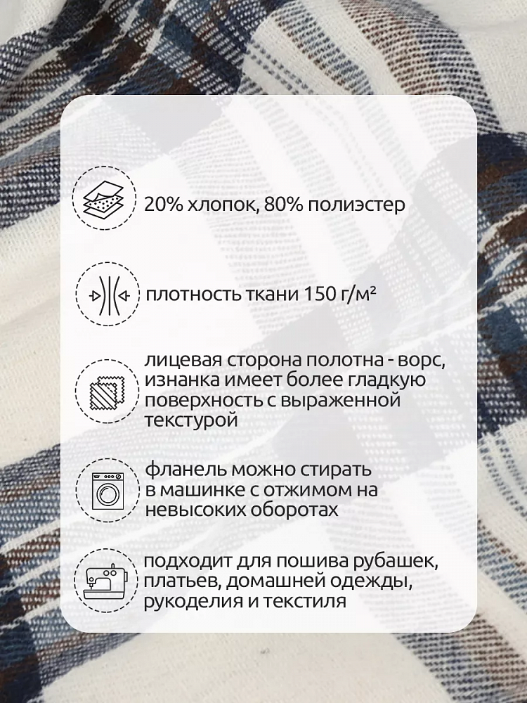 Ткань рубашечная Фланель - смесовый материал, отличающийся своей универсальностью. На лицевой стороне полотна ворс, изнанка имеет более гладкую поверхность с выраженной текстурой. Фланель обладает высокими износостойкими характеристиками, не тянется и не скатывается, при этом ткань мягкая и хорошо удерживает тепло. Актуальный принт в клетку популярен при пошиве таких изделий, как рубашки, платья, а также домашней одежды, рукоделия и текстиля. Фланель можно стирать в машинке с отжимом на невысоких оборотах