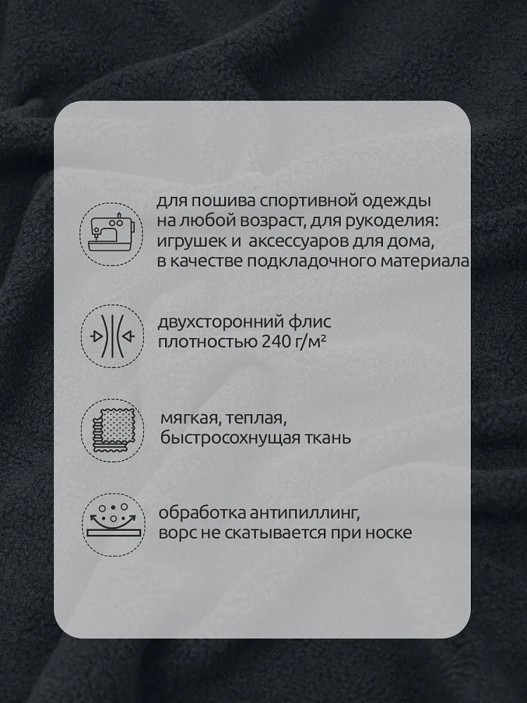 Флис, приятный на ощупь, объемный и мягкий материал. Флис с плотностью 250 г/м², имеет ворс с двух сторон, обе эти стороны "антипиллинг", флис не скатывается при носке. Хорошо сохраняет тепло. Одежда из флиса быстро сохнет. Он прекрасно подходит для пошива теплой одежды. Из флиса шьют: детскую, домашнюю и спортивную одежду, термобелье, пледы, шапки, шарфы, перчатки, мягкие игрушки.