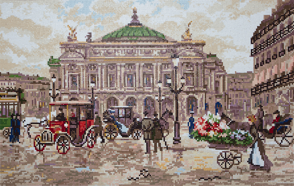 Выполнение работы не требует специальных навыков, выкладывать картину очень легко и просто. Квадратные стразы наклеиваются поверх изображения со схемой на уже нанесенный клеевой слой.