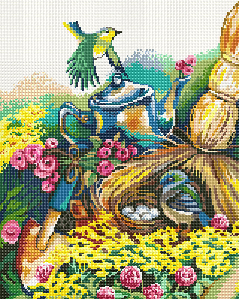 Выполнение работы не требует специальных навыков, выкладывать картину очень просто и легко. Стразы наклеиваются поверх изображения со схемой на уже нанесенный клеевой слой.