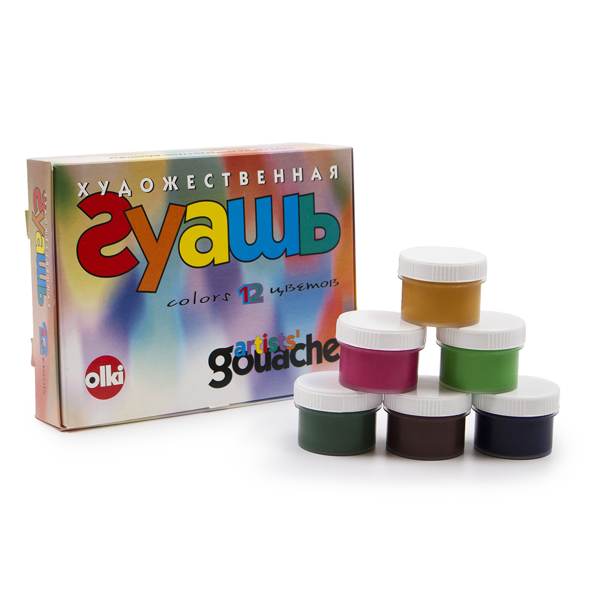 Гуашь в наборе художественная №2 от OLKI – плотная непрозрачная краска с высокой укрывистостью. Имеет насыщенные цвета, после высыхания сохраняет яркость, становится матовой и бархатистой. Если требуется более мягкий оттенок, краску легко разбавить водой. Хорошо ложится на бумагу, картон, фанеру, а также грунтованный холст. Подходит в том числе для детского творчества. Сочетается с акварелью, акрилом, пастелью и другими красками, которые растворяются в воде. Полностью высыхает в среднем через 1,5-2 часа после нанесения. В наборе гуаши художественной №2 12 баночек по 33 мл, всего 12 цветов.