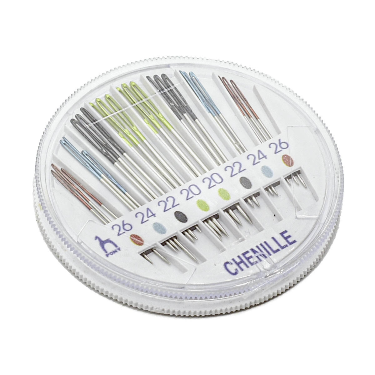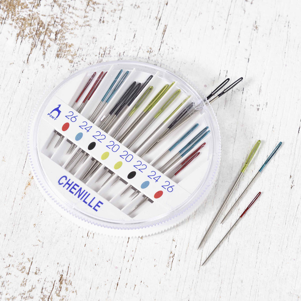 Набор Pony 'Chenille' включает в себя 24 стальных иглы разных размеров, каждому из которых соответствует определенный цветовой маркер. Прочные толстые иглы с широким позолоченным ушком и острым концом способны одновременно прокалывать несколько слоев ткани. Идеальный выбор для работы в технике 'синель'. Подходят также для вышивания лентами, гладью или для мелкого ремонта трикотажных и текстильных изделий. Набор упакован в компактный пластиковый футляр-розетку с прозрачной поворотной крышкой и ячейками, обеспечивающий аккуратное хранение содержимого и безопасное извлечение нужной иглы. Длина игл: 44-32,5 мм. Толщина игл: 1,09-0,61 мм. Номер игл: №20-26.