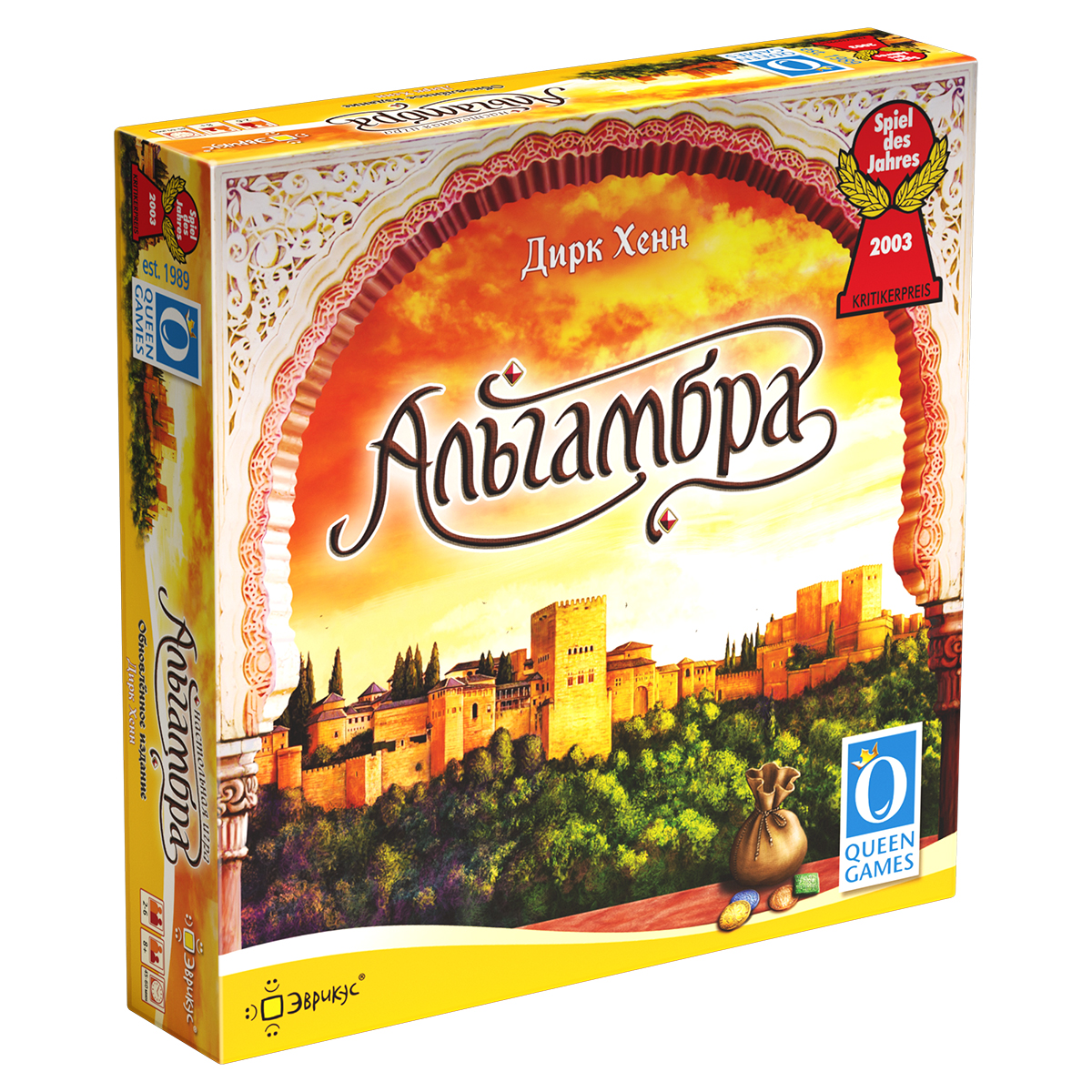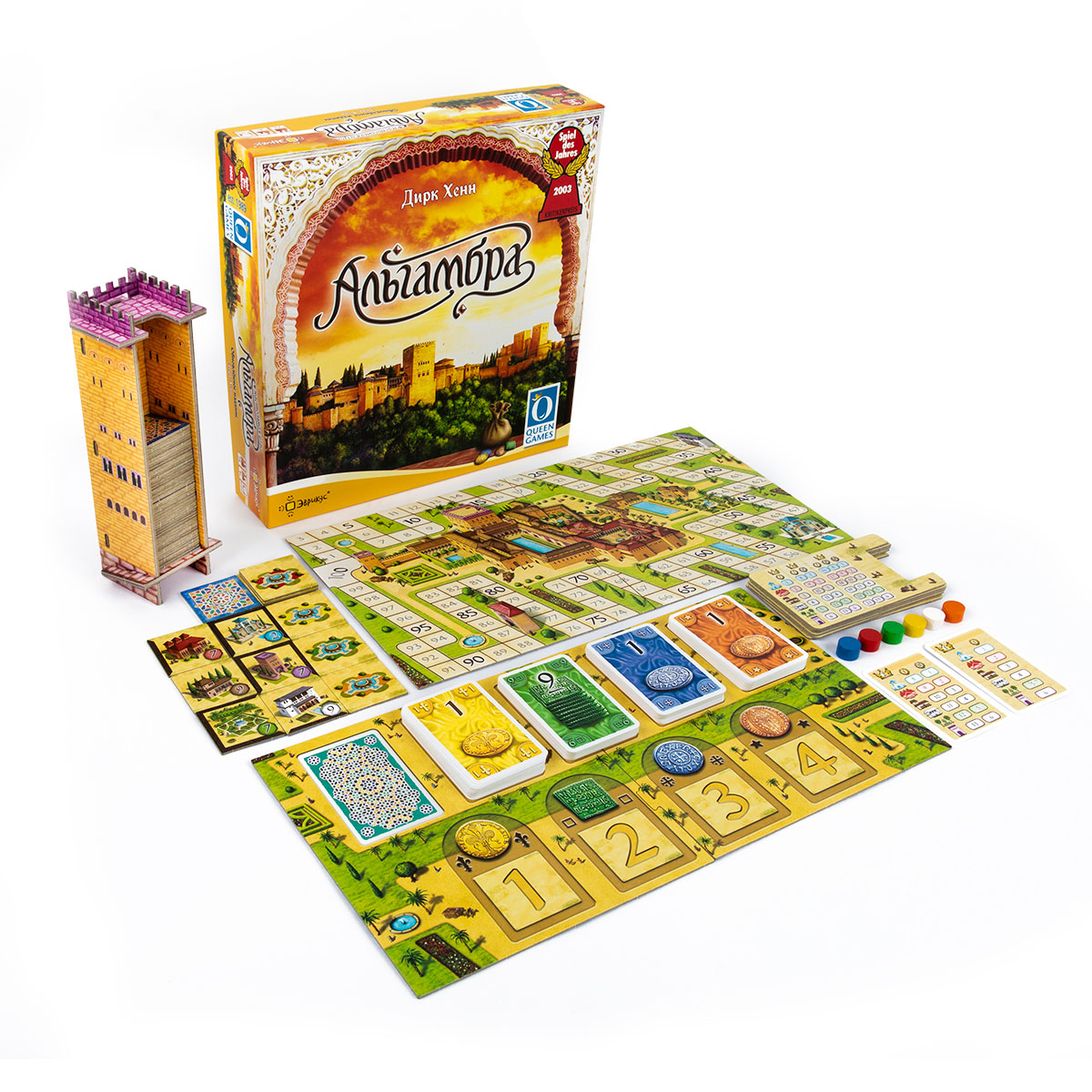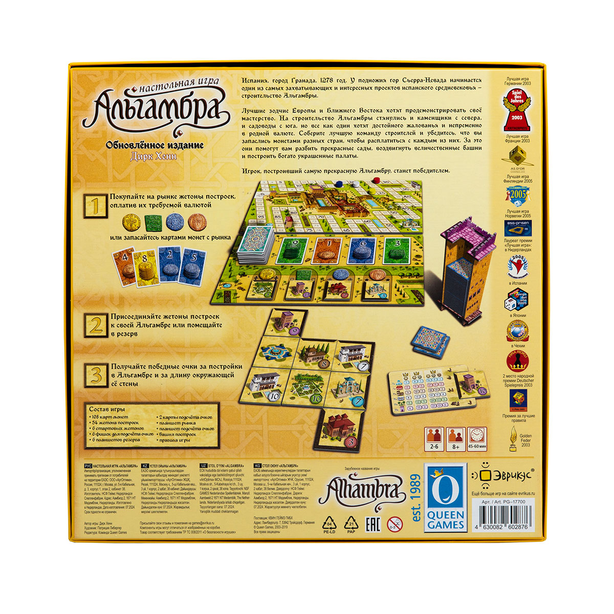 Вам предстоит копить карты монет 4 разных типов, чтобы затем покупать жетоны построек на рынке и размещать их в своей Альгамбре, следуя правилам строительства. В течение игры происходит 3 этапа подсчёта очков - очки распределяются в зависимости от количества построек разных видов. Игрок, набравший больше всего очков, победит!