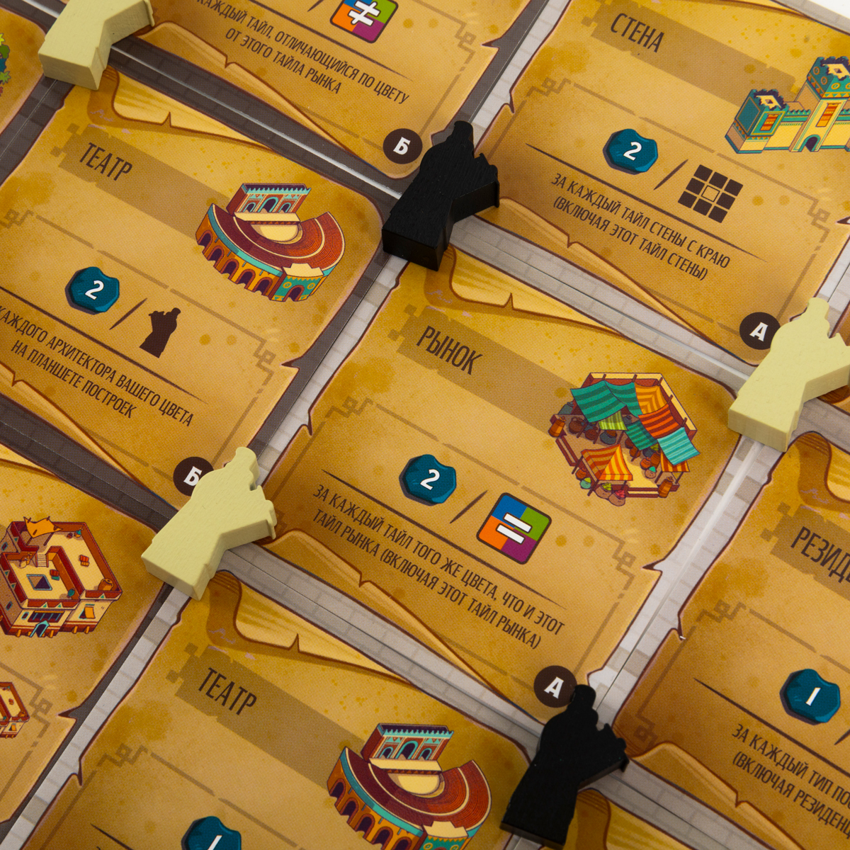 2. Игрок выбирает тайл постройки из доступных на планшете построек, забирает этот тайл в руку, а не его место выставляет своего архитектора.