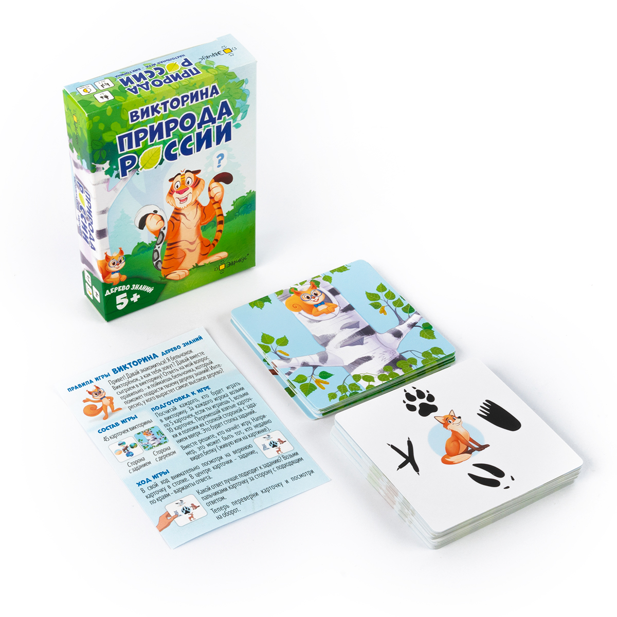 «Дерево знания. Природа России» — это настольная игра-викторина для детей от 5 лет, в которой юные игроки смогут проверить свои знания, отвечая на вопросы о флоре и фауне нашей родины: где обитают те или иные животные, чем они питаются, какие у них следы и другие особенности, какие растения можно встретить в России, чем они отличаются друг от друга, а также вопросы про климат и времена года.
